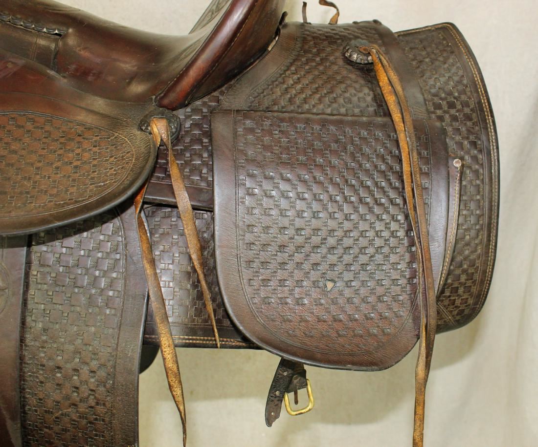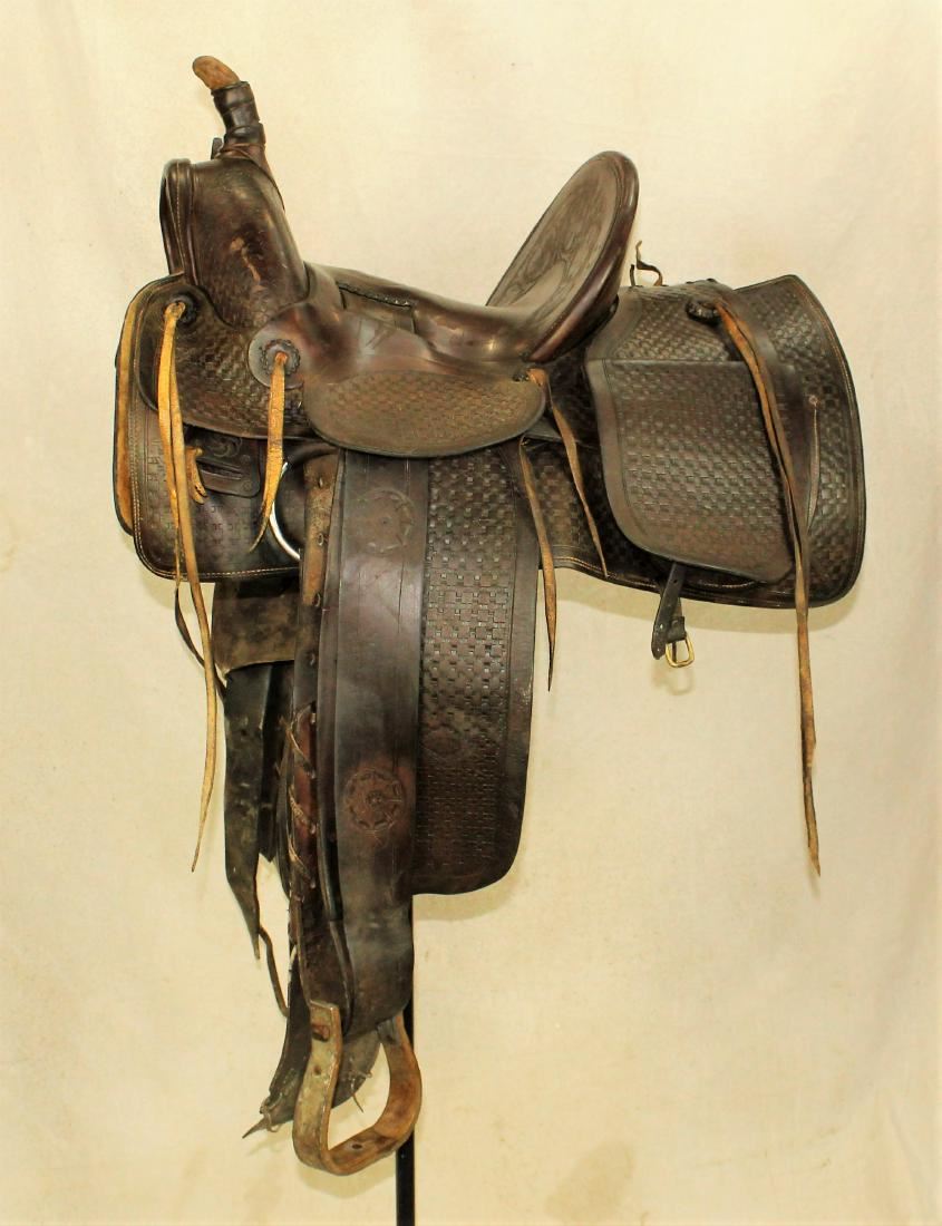 Wonderful Lewistown, Mt. made high back saddle with radical 5 1/2" cantle, bow fork front end. Showing interesting full basket stamp pattern and medium chocolate color and in good condition,.