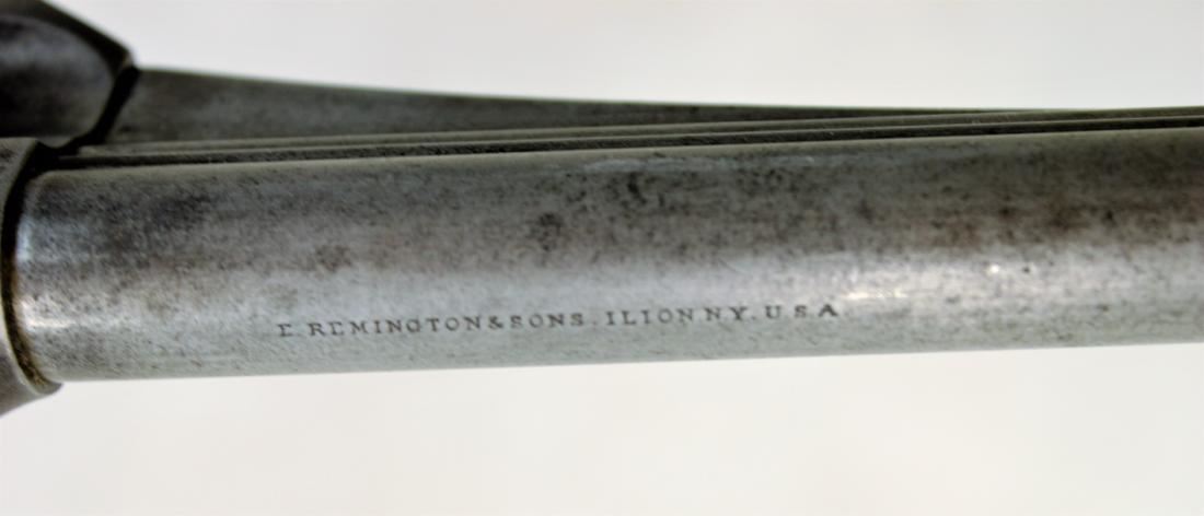 Chambered in .44 caliber, 7 1/2"" barrel length, with two digit serial number. Top of the barrel marked "E. Remington & Sons. Ilion, N.Y. U.S.A.". Stud front sight and 6 shot cylinder. Blue finish with walnut grips. The grips are hand carved with a linear and checkered pattern. "J.J." carved on the bottom of the grips.