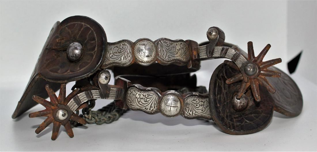 Handsome pair of early unmarked California style spurs, single mounted with finely engraved silver that appears to be Hernandez, with radical drop shanks, multi-point rowels and original straps.