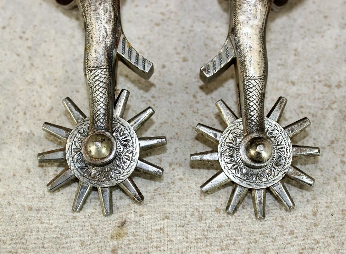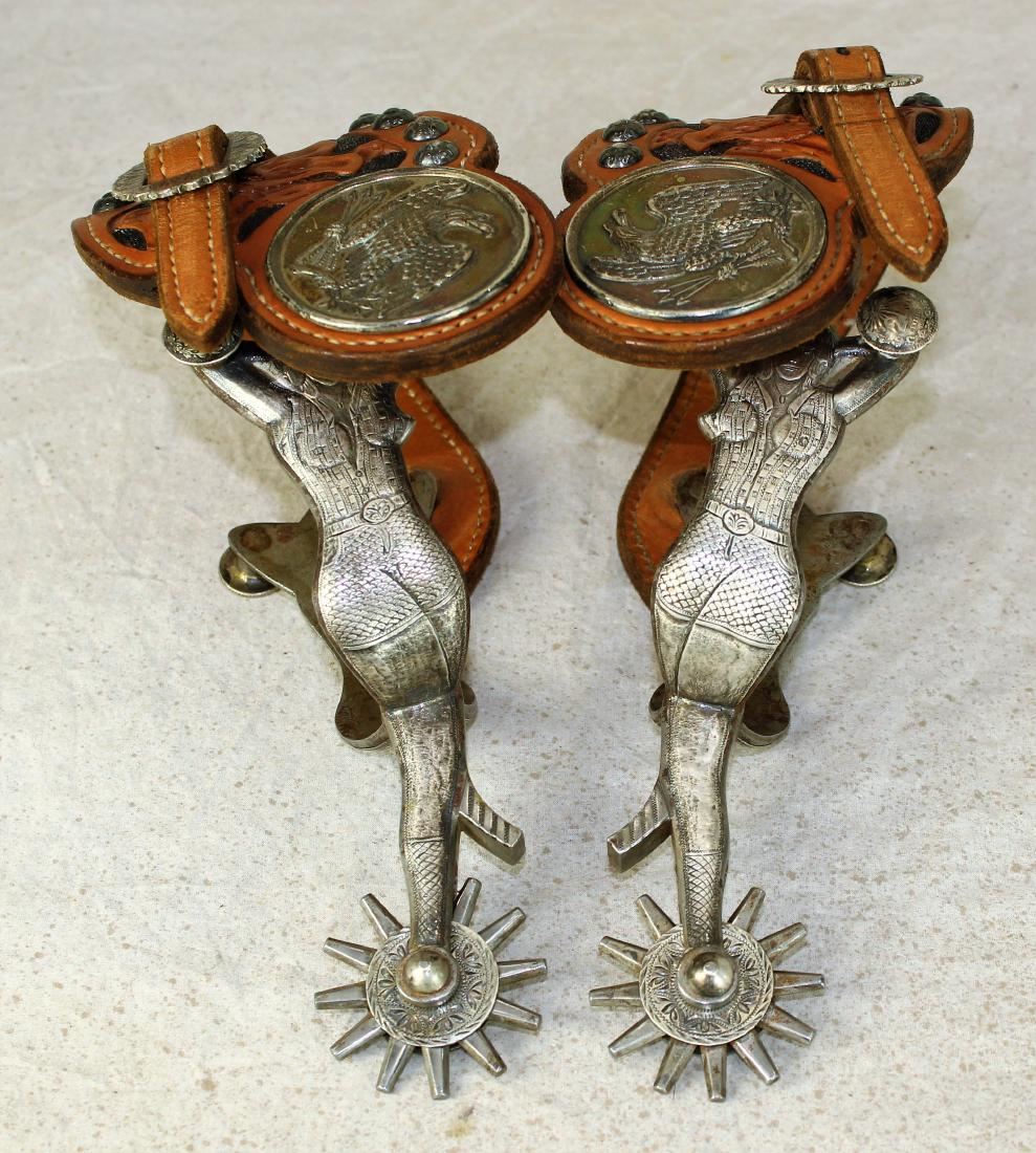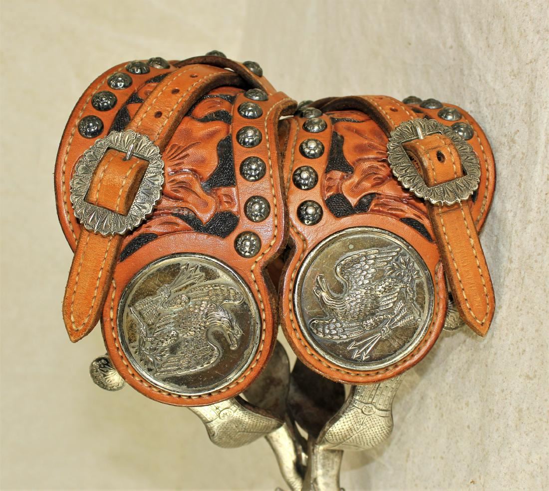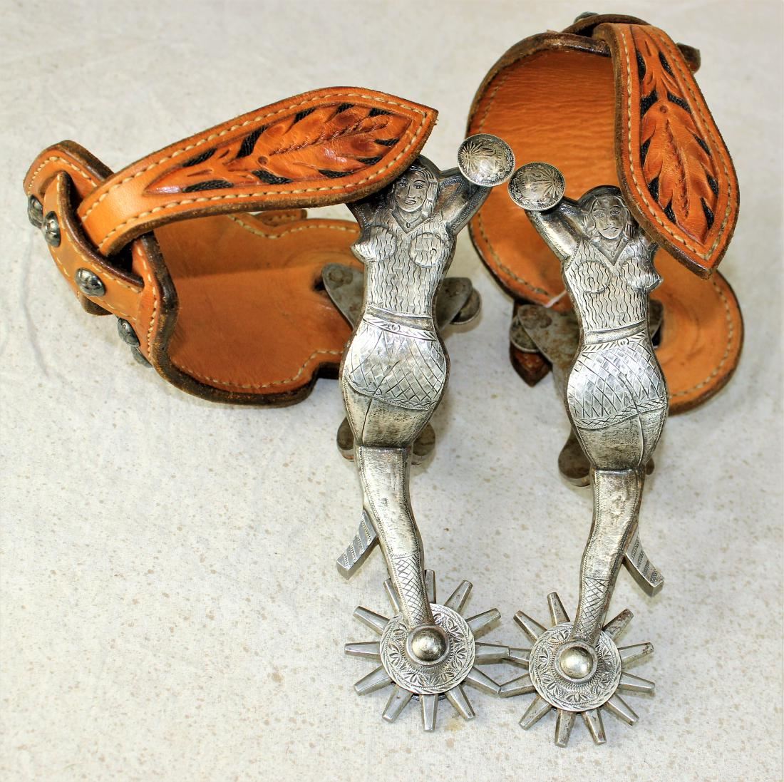 Intriguing large California sytle spurs, double mounted with scalloped three dimensional dancing girls, and fantastic studded straps.