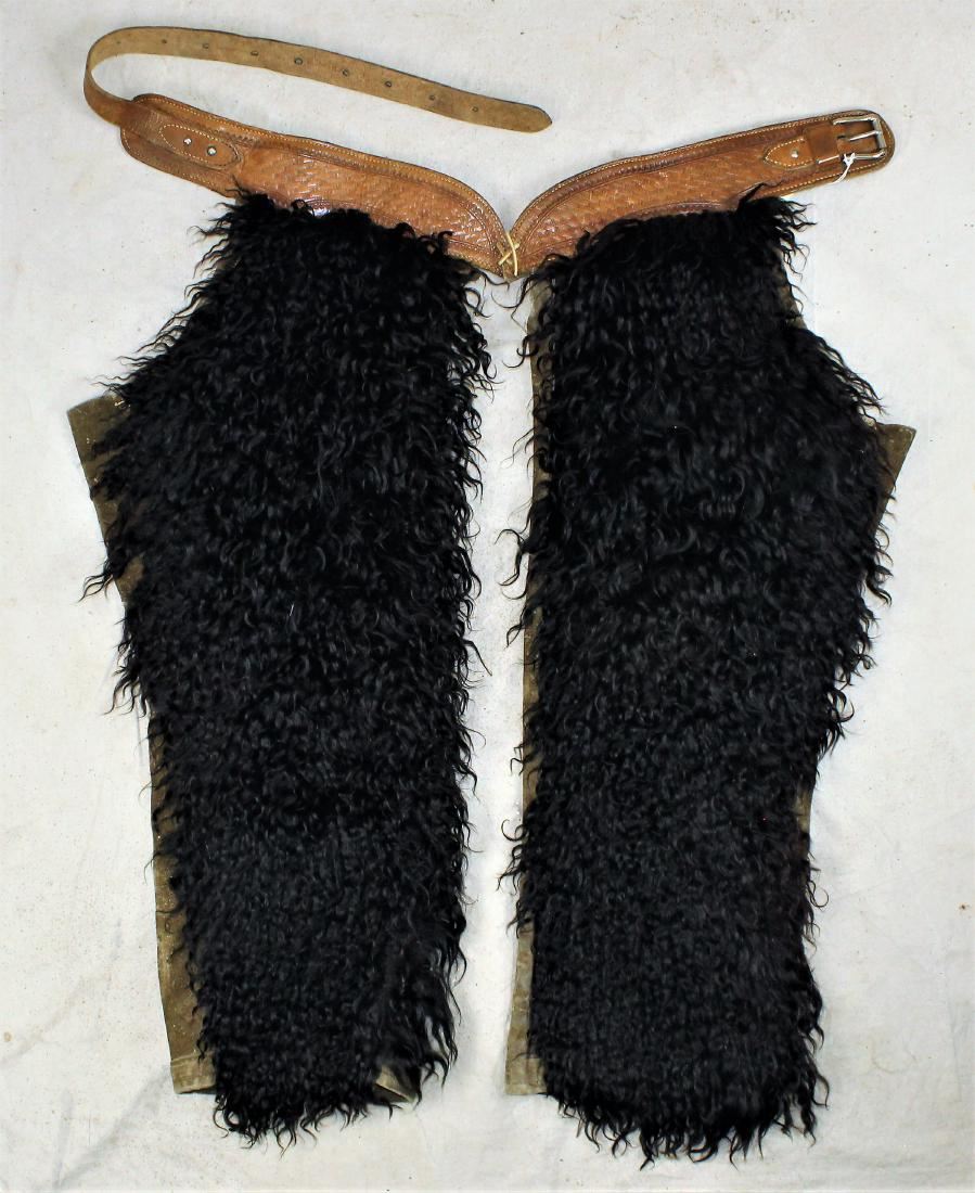 Boldly colored black chaps with extra curly hair and basket stamped belt. Displaying great presence and eye appeal.