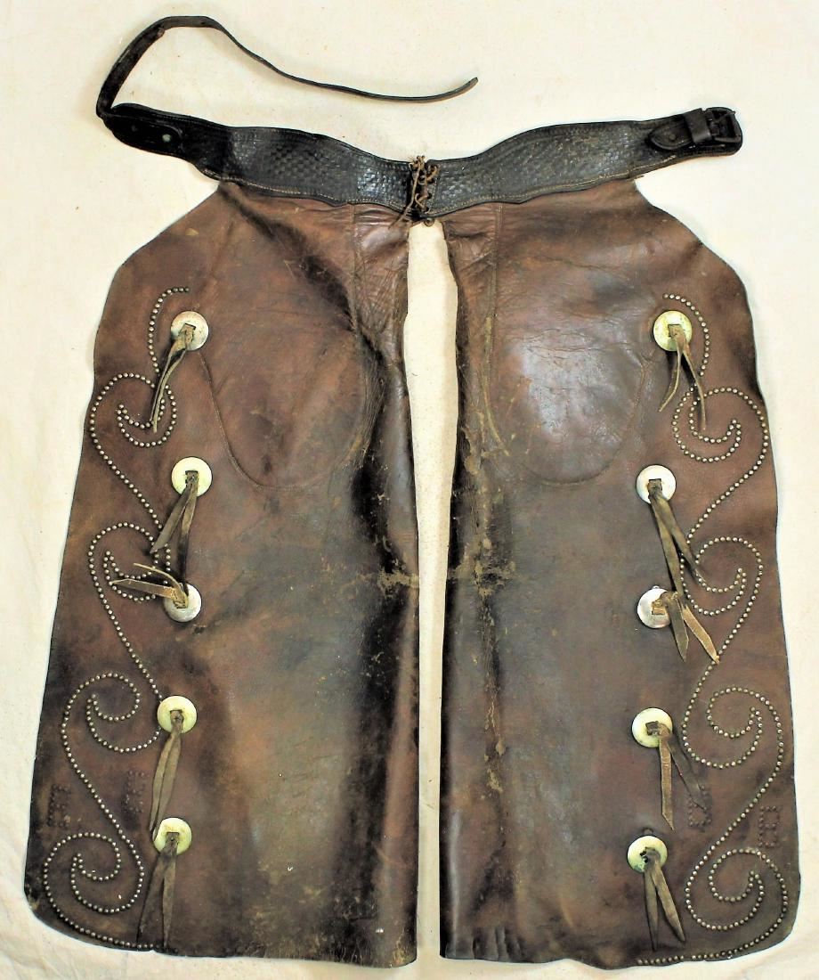 Large batwing chaps with stylish swirling stud design, 10 large nickel saddlestring conchos, and wide basket stamped belt with uncommon maker's mark.