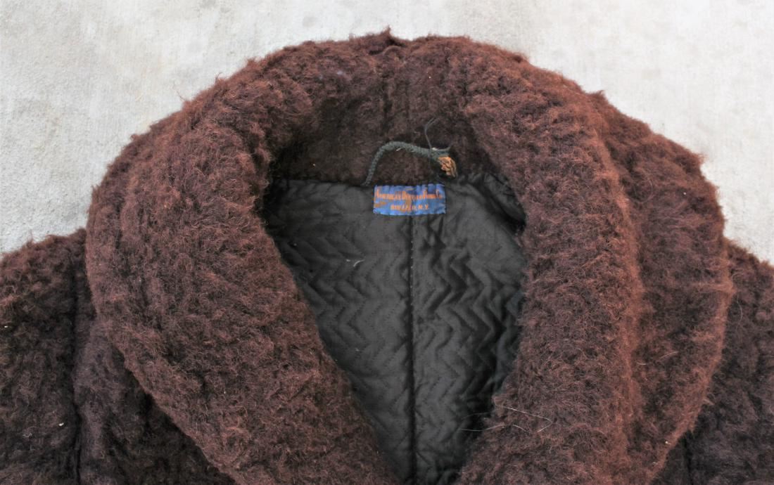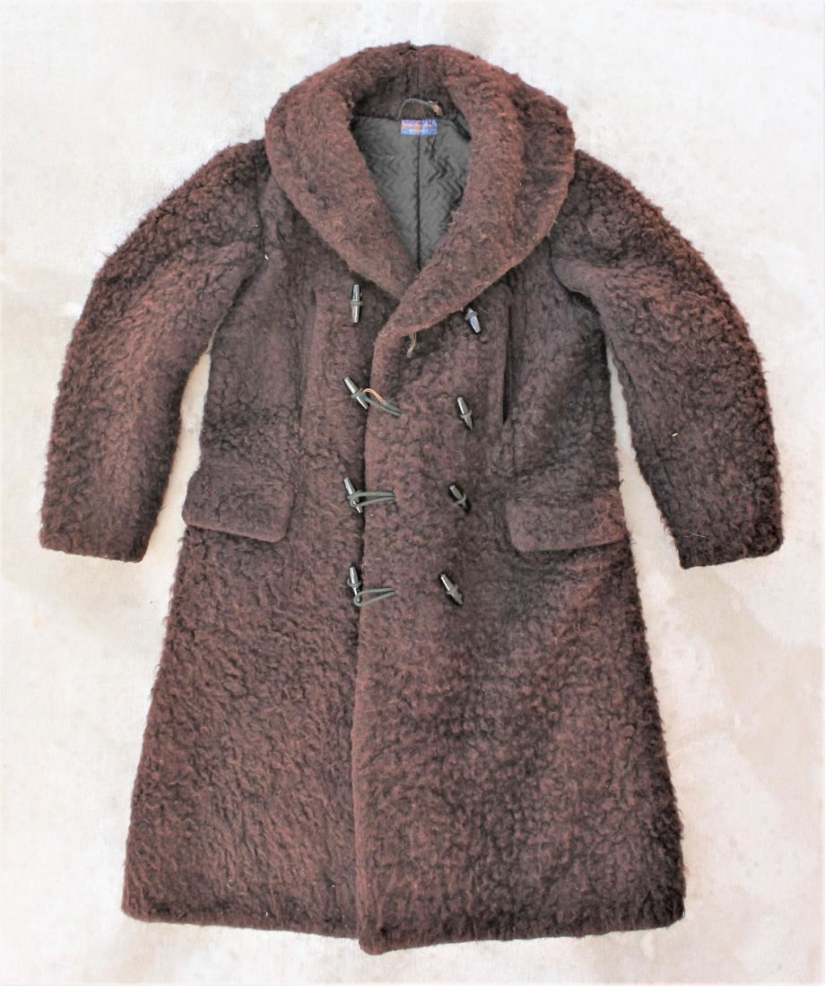 Large comercially made coat by American Buffalo Robe Co., Buffalo, NY having fine buffalo hair, wooden toggle buttons and quilted liner.