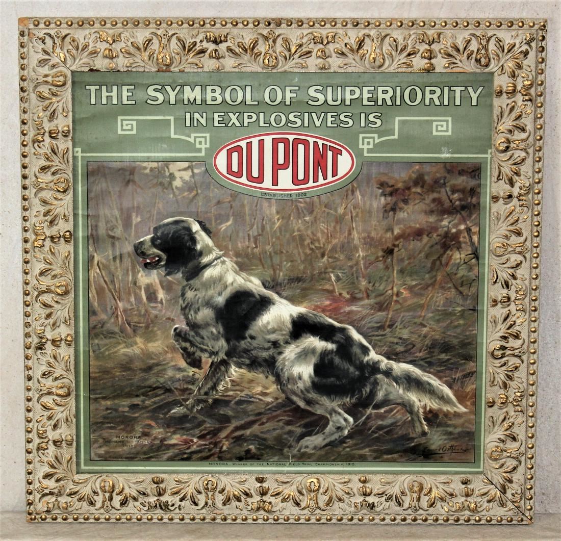 Brilliantly colored firearms related advertisment depicting hunting dog with great graphics and eye appeal. Showing great colors and period frame, measuring 19 1/2 x 19 1/2.