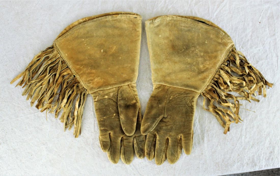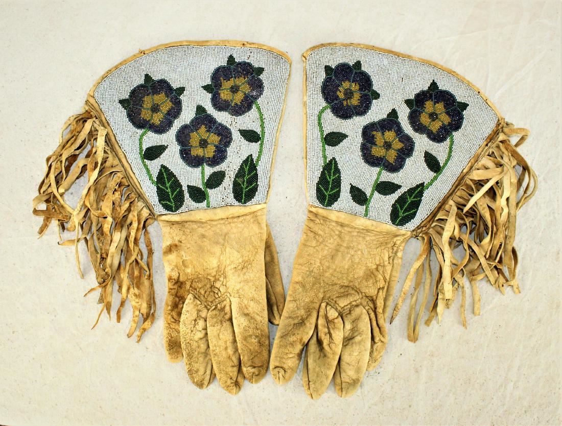 Showy large gauntlets with great fringe, and fully beaded cuffs with blue and green cut glass flowers on white background. In very nice condition.