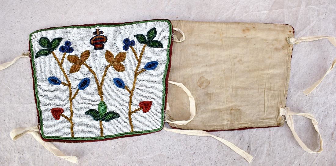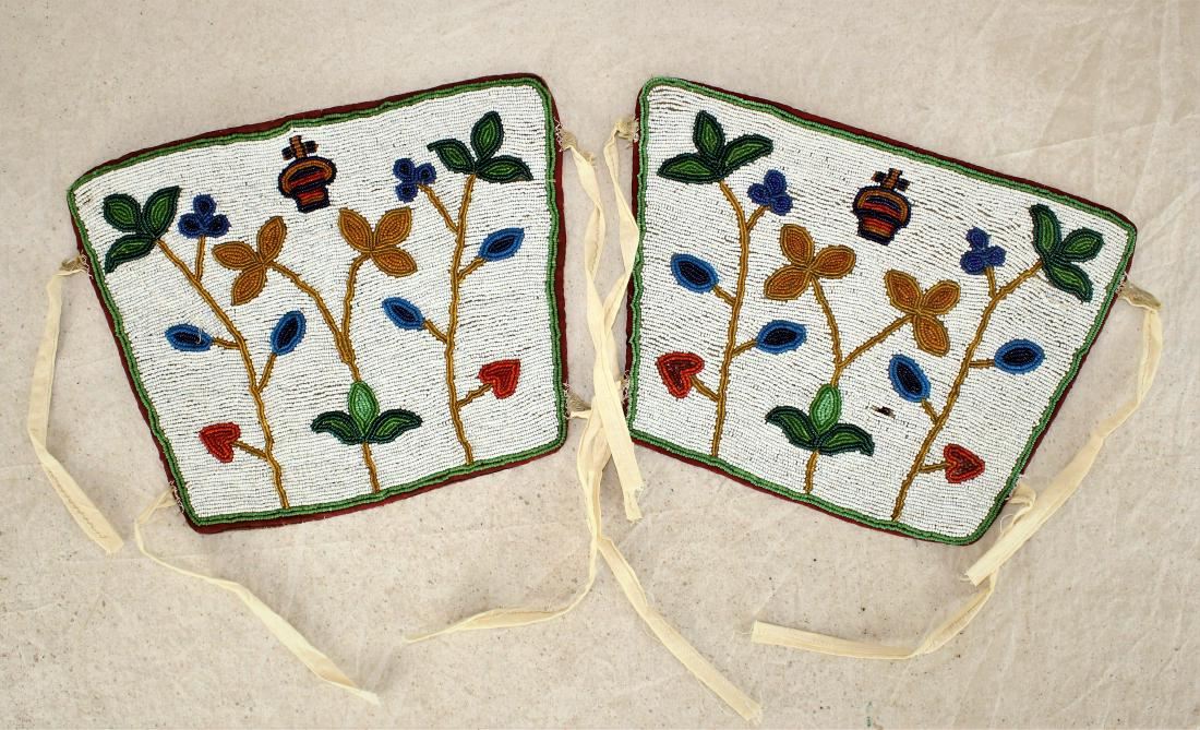 Large pair of flat beaded cuffs with colorful floral design on white background, and period material lining.