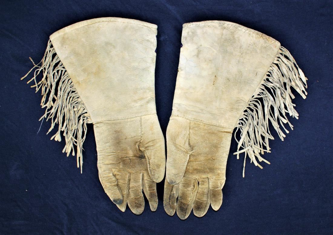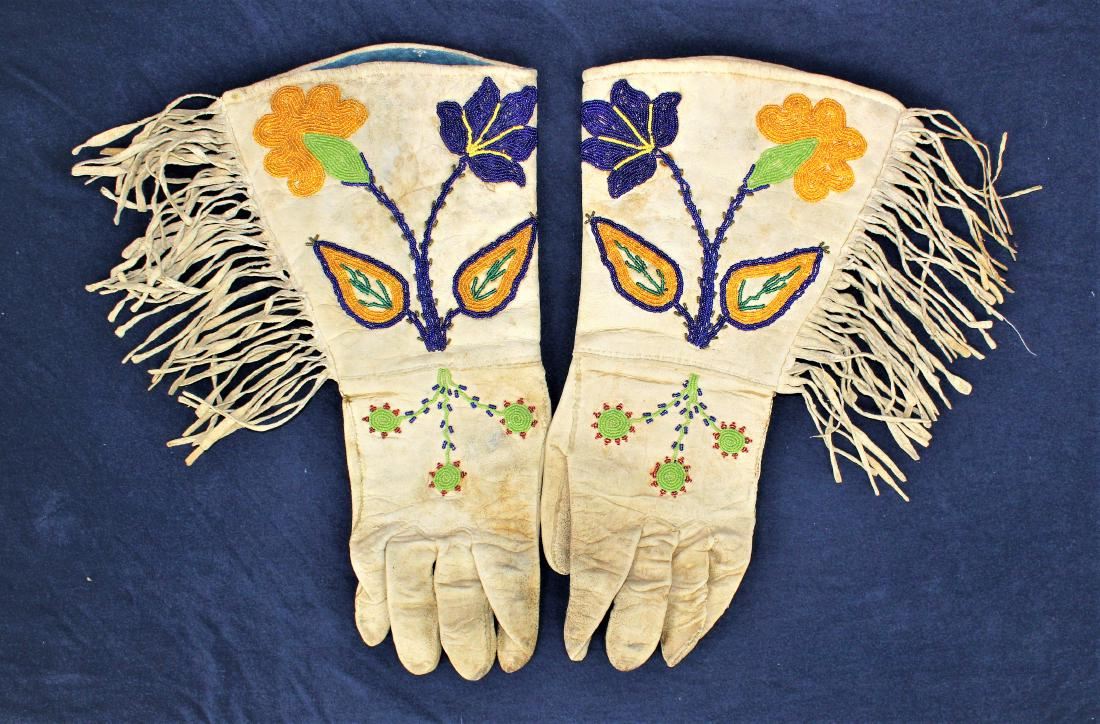 Stylish large gauntlets beaded with appealing floral pattern on light colored buckskin leather with long fringe.