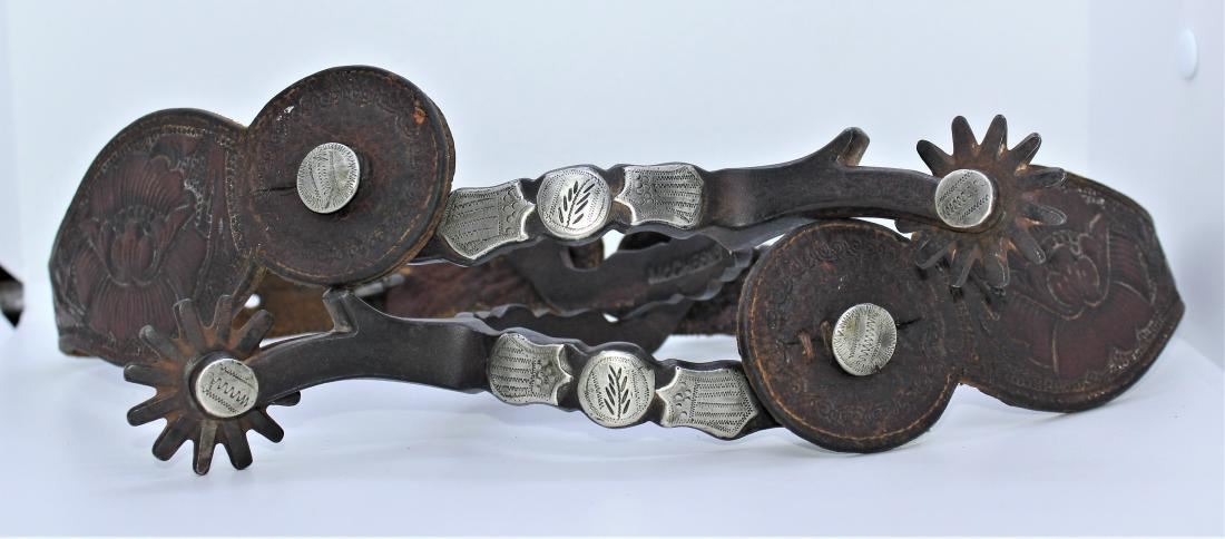 Seldom seen maker marked McChesney #3-2 pattern single mounted spurs, with laying down sheilds, scalloped heelbands and multi-point rowels. Accompanied by nice original flower tooled straps.