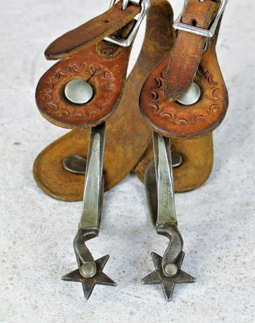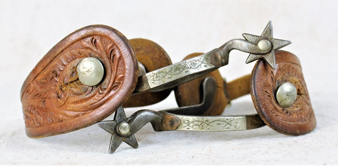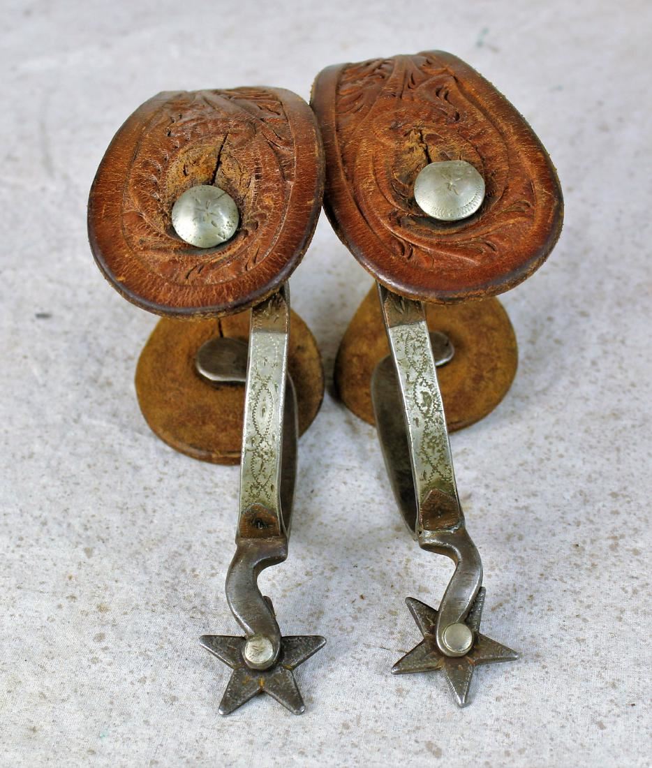 Super rare double mounted cowgirl spurs with two tone mountings, fish hook shanks, and engraved five point rowels.