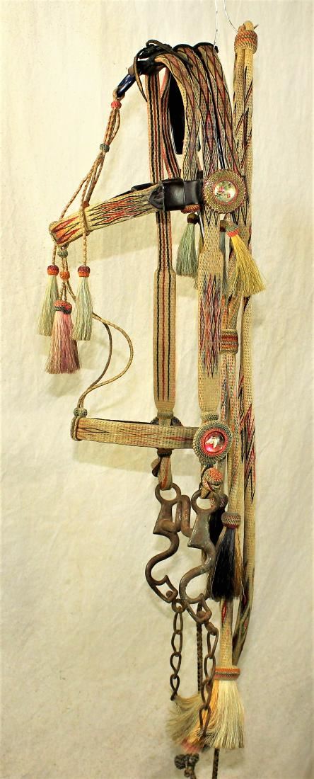 Attractive ranch used hitched horsehair bridle with nine color geometric design, with original iron bit and split reins.