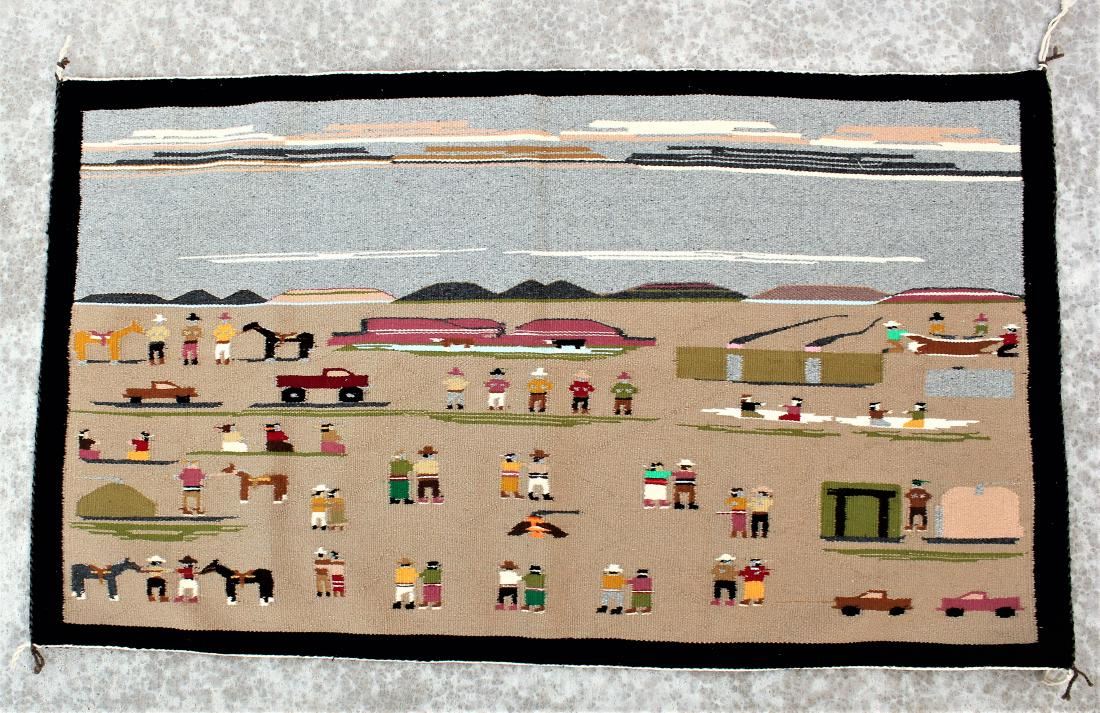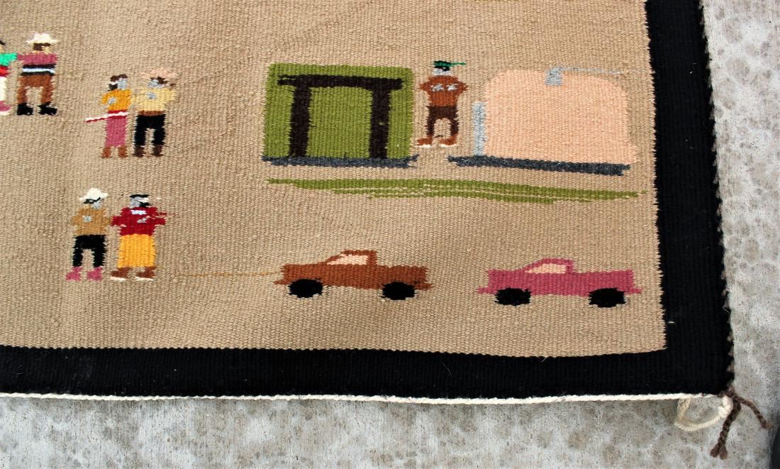 Impressive pictorial weaving depicting reservation scene, depicting an event with many couple spectating, along with horses and cattle, and their trucks. Showing great detail and fine condition. Measuring 51"x 29".