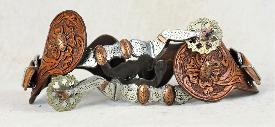 Great looking lady leg spurs with copper and silver double mounted with cut-out card suit rowels.
