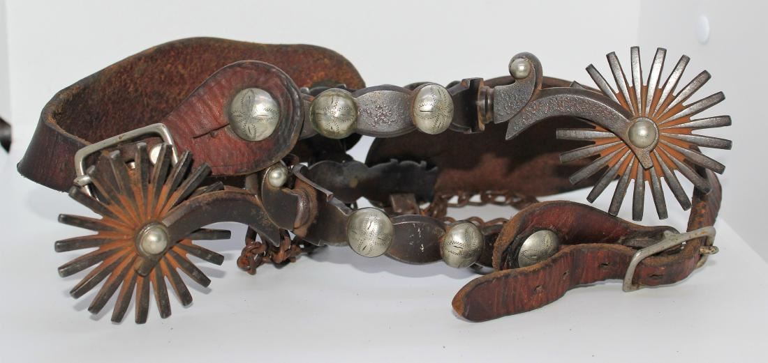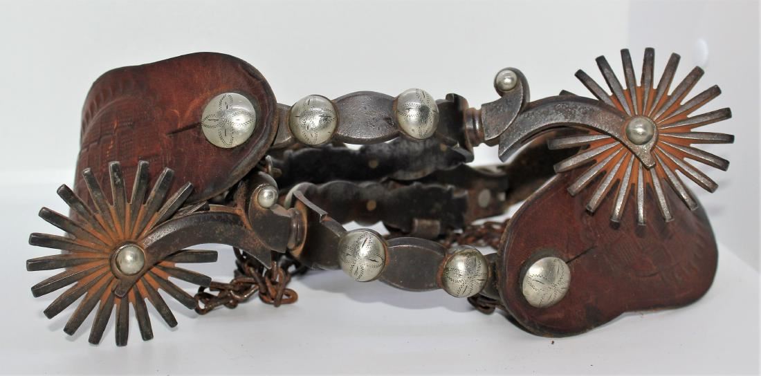 Interesting large scalloped unmarked California style spurs with engraved domes, pronounced decorative shanks, massive rowels and original straps.