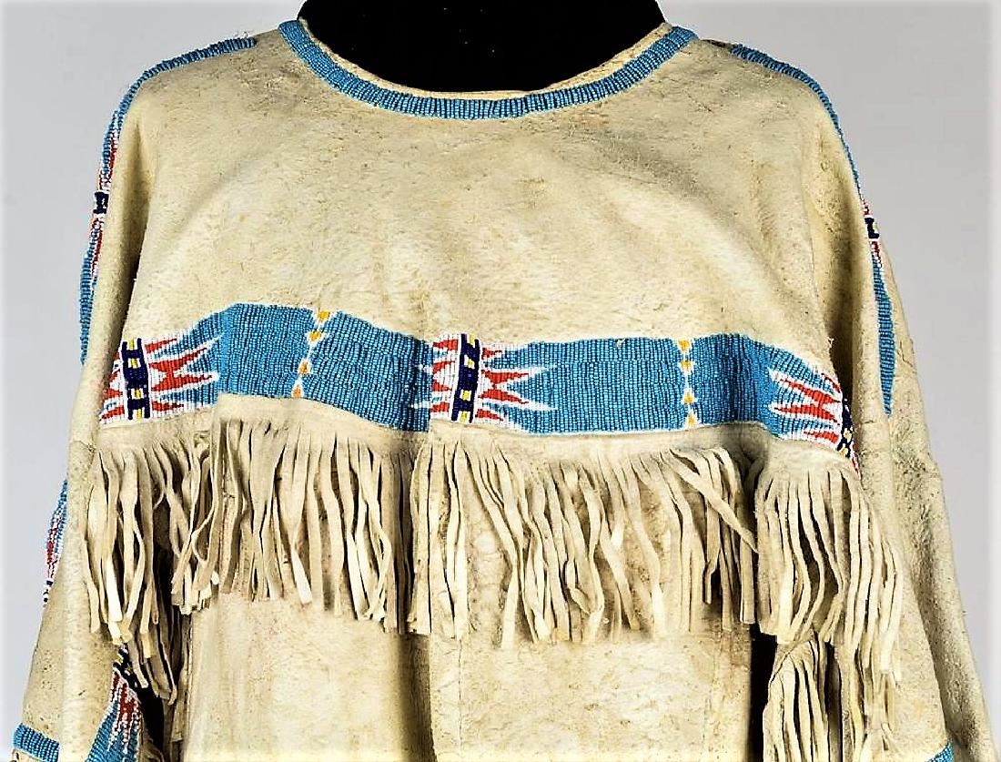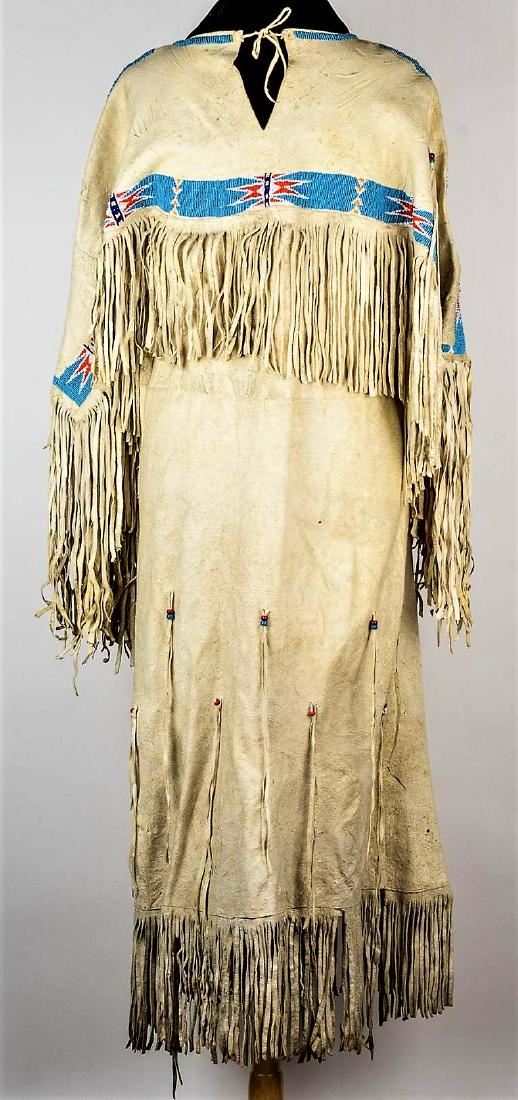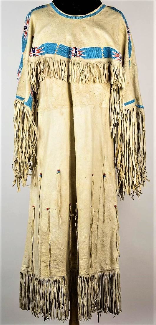 Attractive Southern Cheyenne 1920's beaded dress, with appealing beadwork design and fabulous fringe, on native tanned hide.