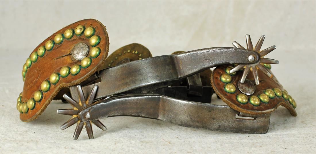 Large single mounted spurs with brass and silver overlay, swinging heart buttons and great studded straps.