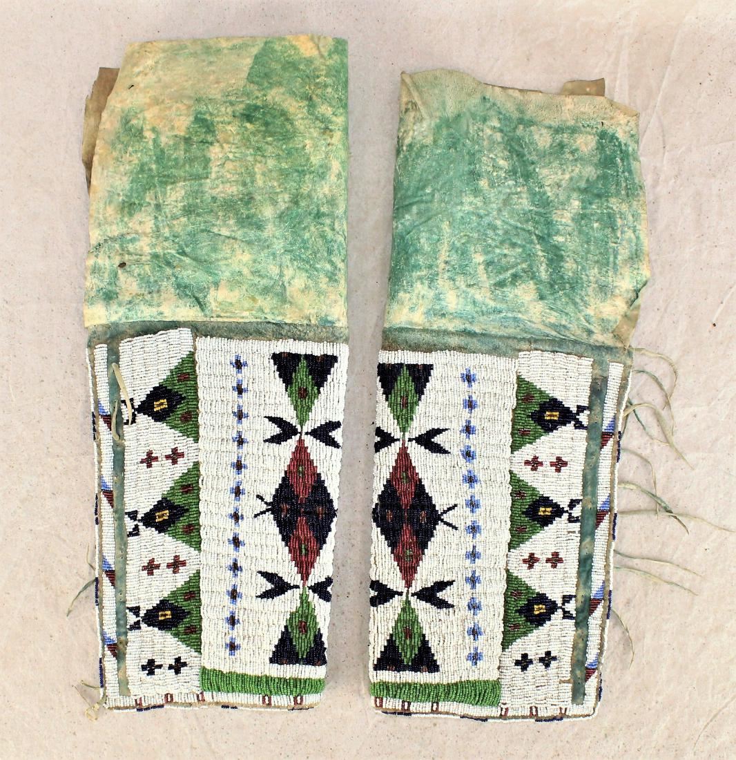 Fantastic large pair of beaded leggings on brain tanned hide, with incredible green ocre, intricate geometric pattern, with early red white heart, cobalt blue, and green beads. In wonderful condition.
