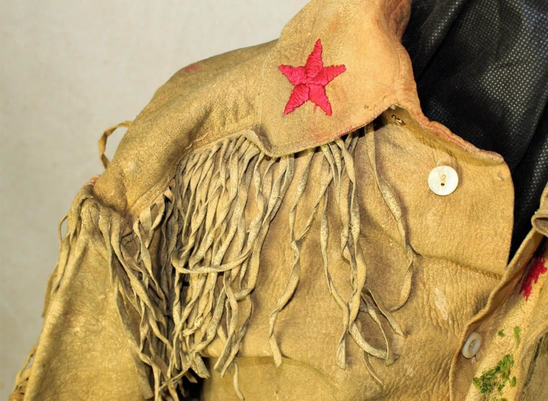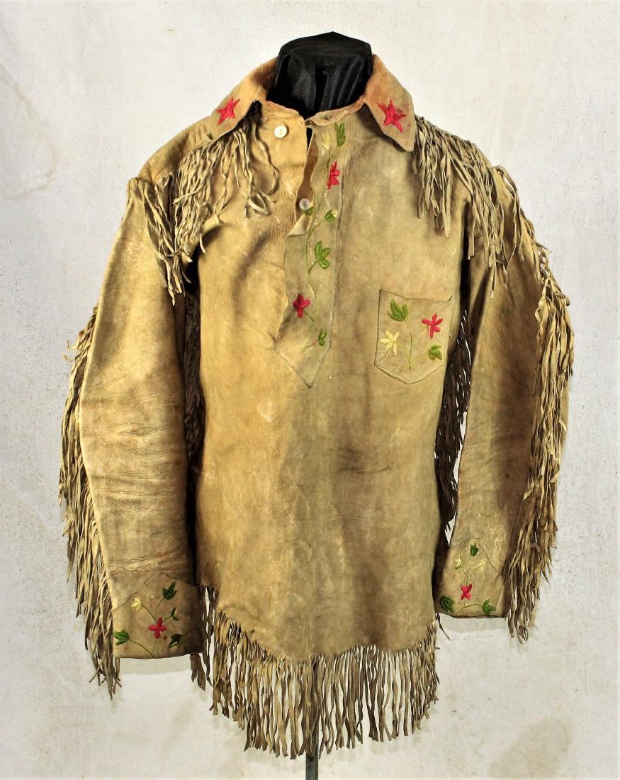Very attractive buckskin shirt decorated with pictorial stitch pattern and fringe, showing great color, age, and wear.