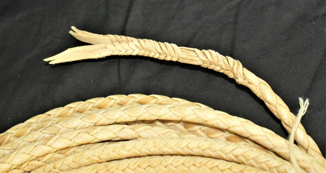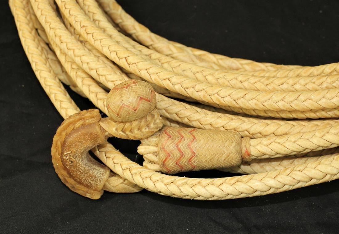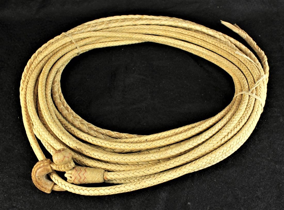 Indcredible long rawhide rope braided from 8 plait transitioning to 4 plait ending in fantastic colored hondo. In unused condition and measuring appoximately 50 ft.