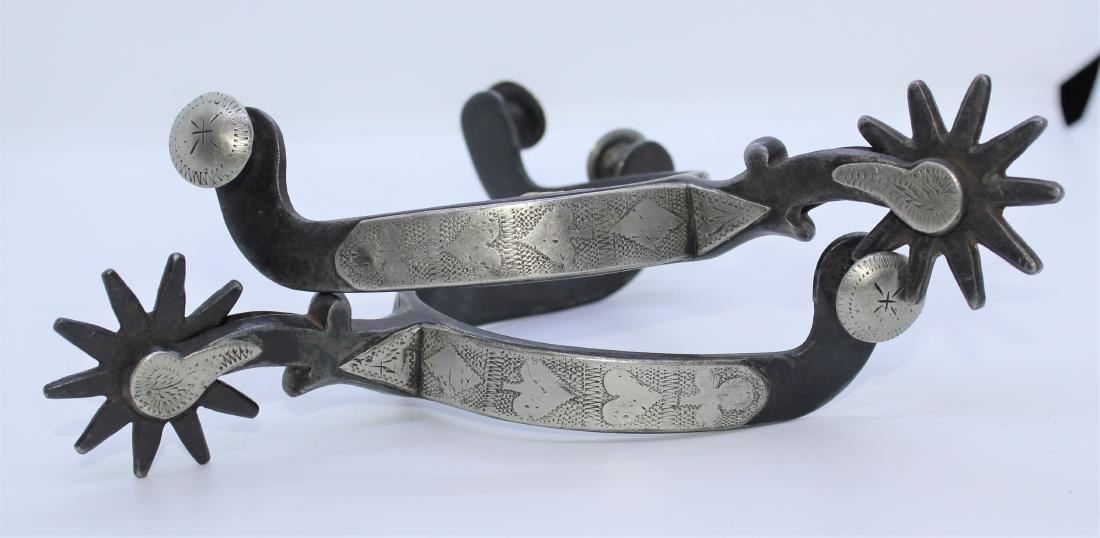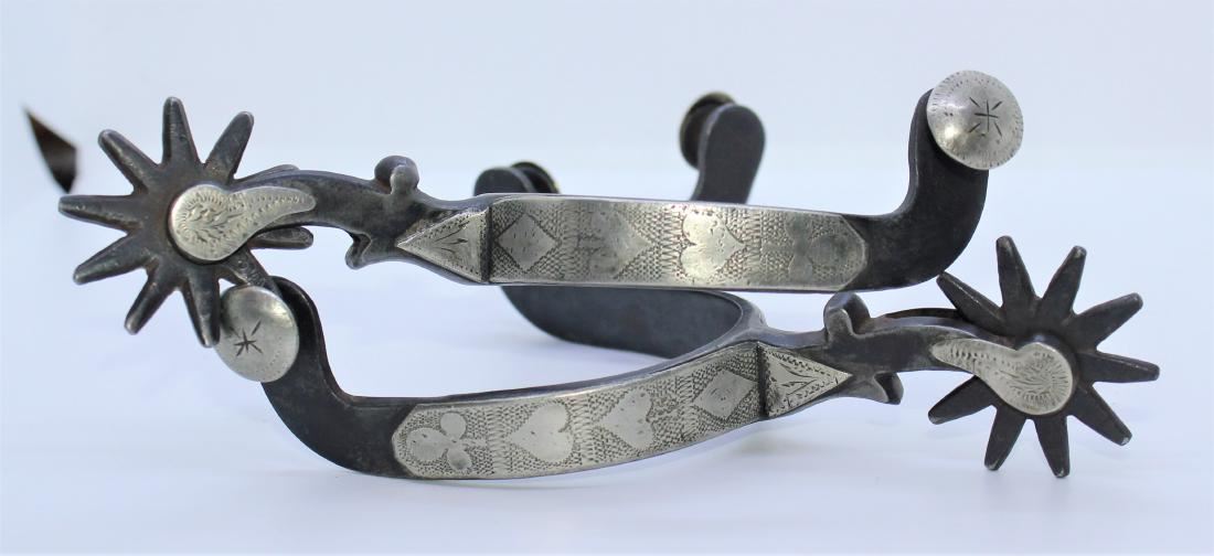 Spectacular pair of exceptionally rare double mounted card suit spurs with intriguing shanks and multi-point rowels. In very nice condition with hints of original finish.