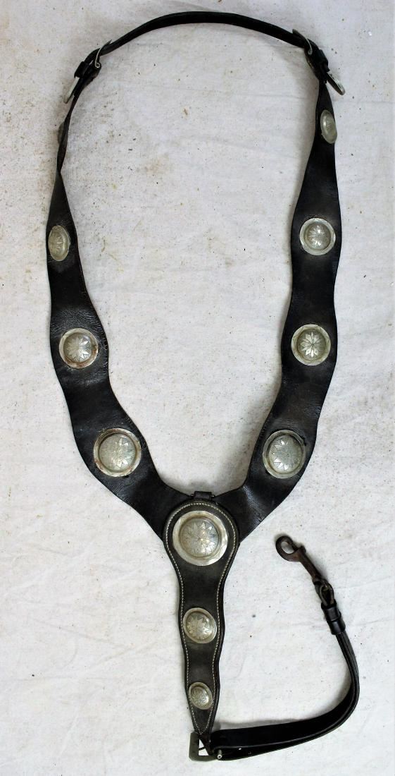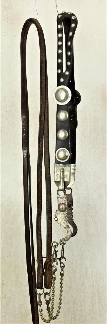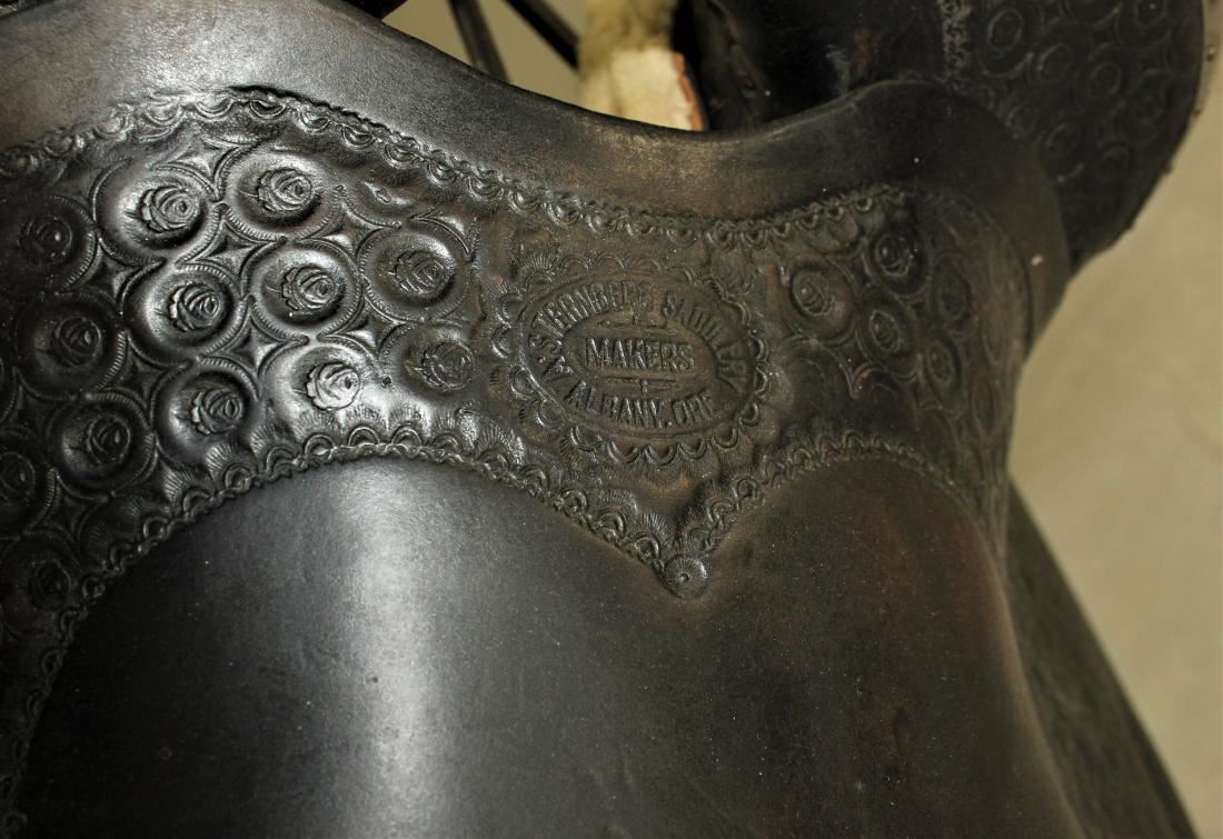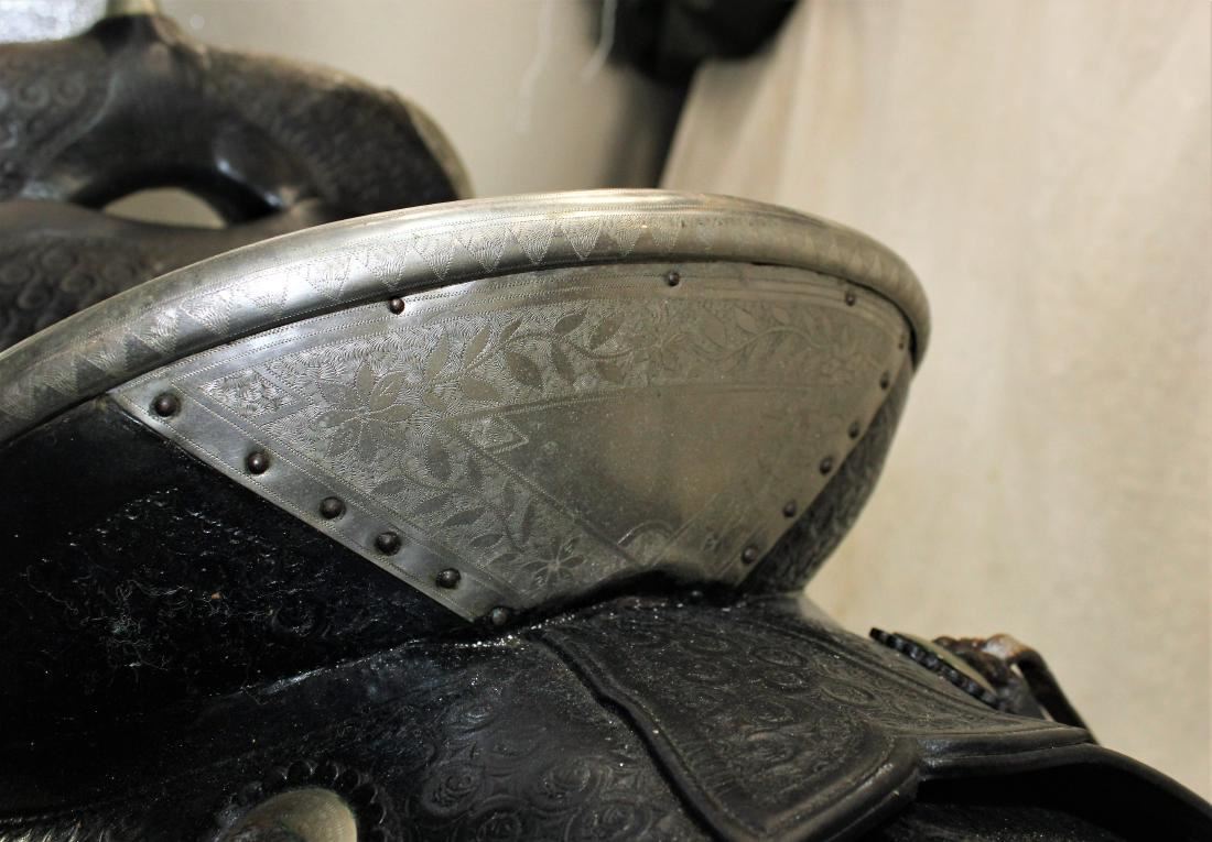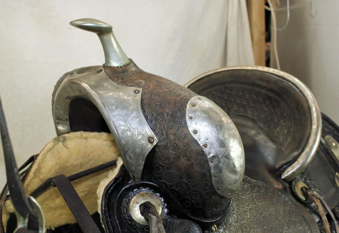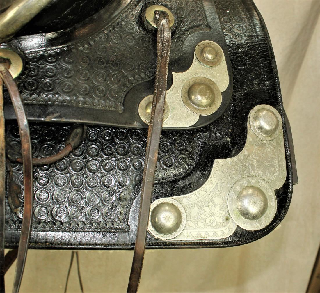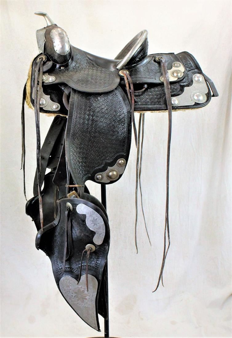 Eye dazzling early silver mounted saddle made by A. Sternberg Saddlery, Albany, Oregon. Leather fully tooled and accented with beautifully engraved domed corner plates, bound cantle and massive 23" tapaderos. Set off by it's accessories that include silver mounted bridle and martingale. Showing very good conditoin and 14" seat.