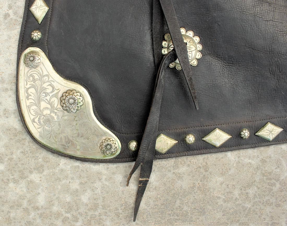 Attractive black batwing chaps mounted with engraved nickel silver perimeter corner plates and conchos, in very nice condition.