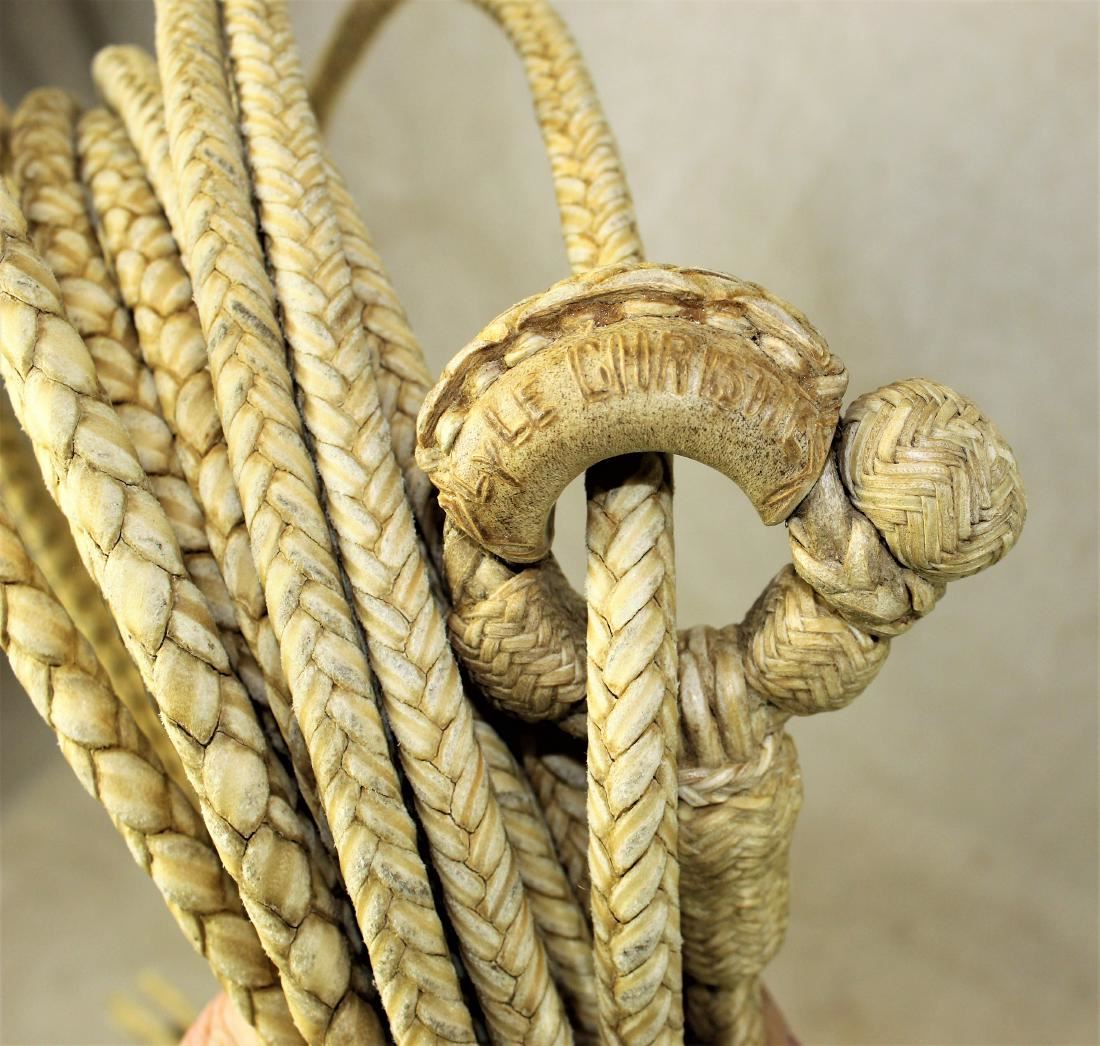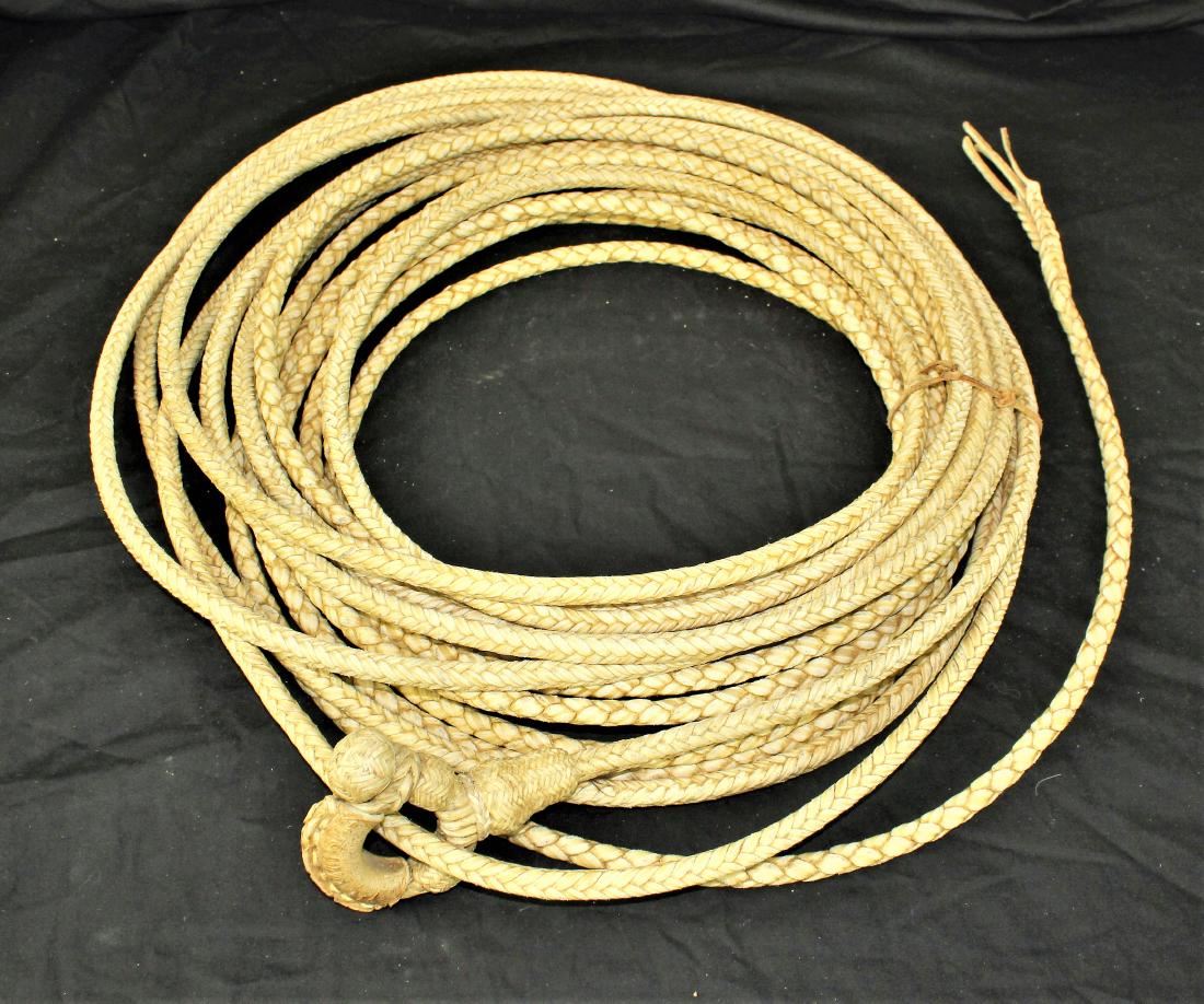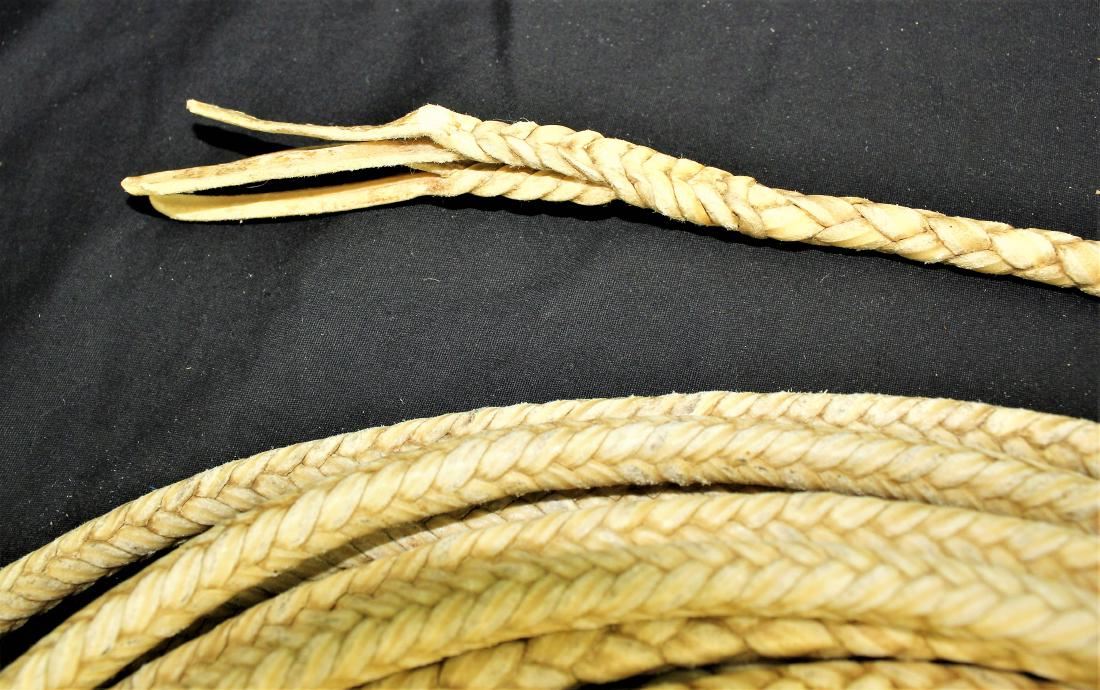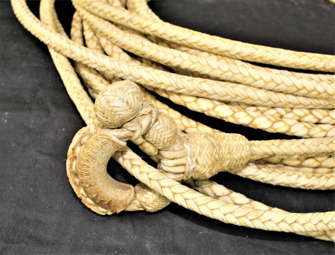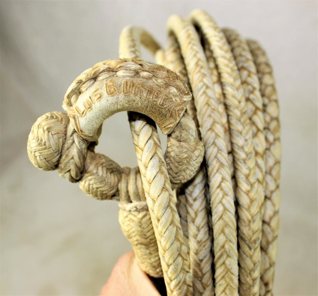 Outstanding presentation rawhide rope made by the master, Luis Ortega, a display of his talent braiding from 4 plait transitioning to 8 plait, with incrediable maker marked hondo, in mint condition. Measuring appoximately 45 ft.