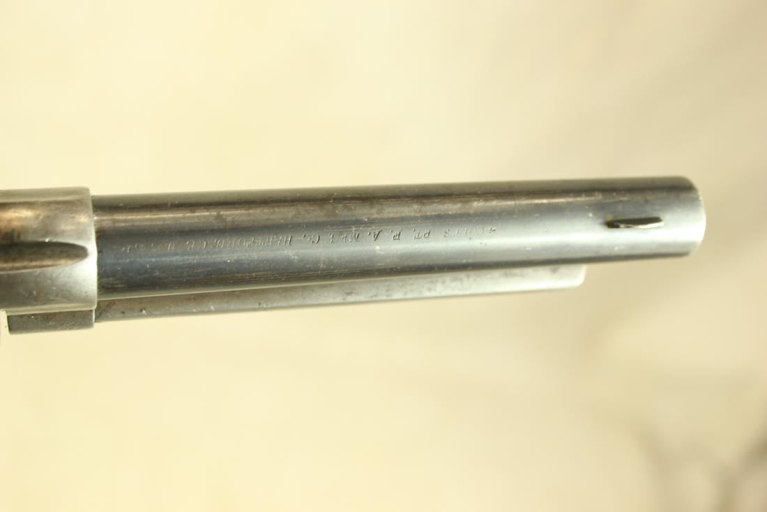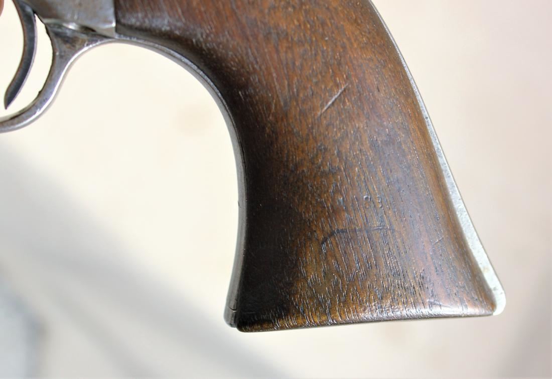 U.S. Colt Model 1873 Single Action ''Artillary'' Cartridge Revolver, frame #8778 (mfg'd 1874) with two-line patent dates and bold U.S. marking, other serial numbers mixed (no number on butt), .45 Colt cal., 5.5'' round barrel with one-line Hartford address, blue and case hardened finish, one-piece walnut grips, and steel grip straps. Condition is good to very good showing overall smooth metal; most of a later reblue remains on barrel. Grips are smooth, solid and very good, showing light inspector cartouches on both sides. Smooth, tight action, and clean bore.