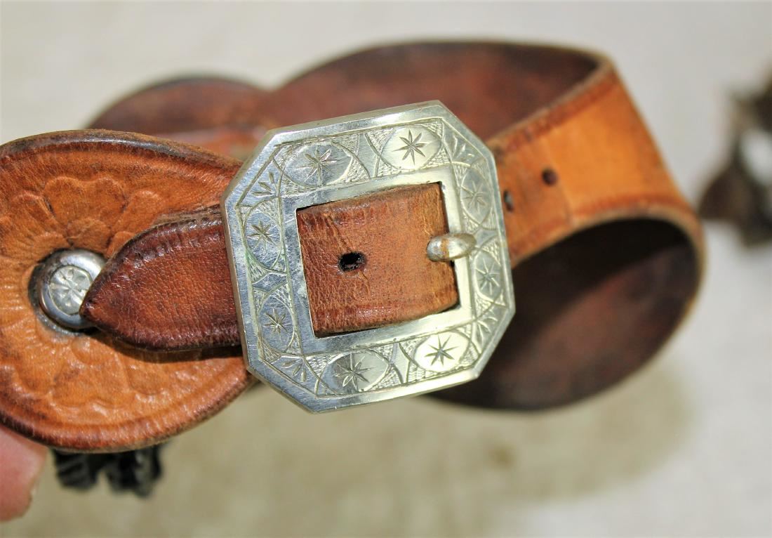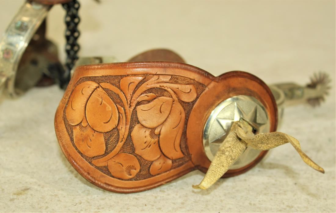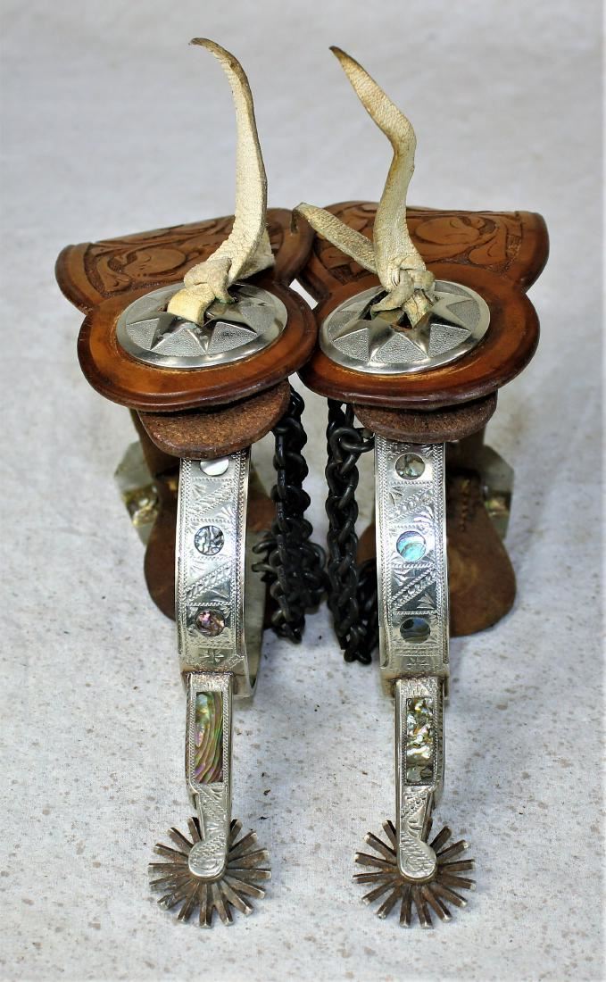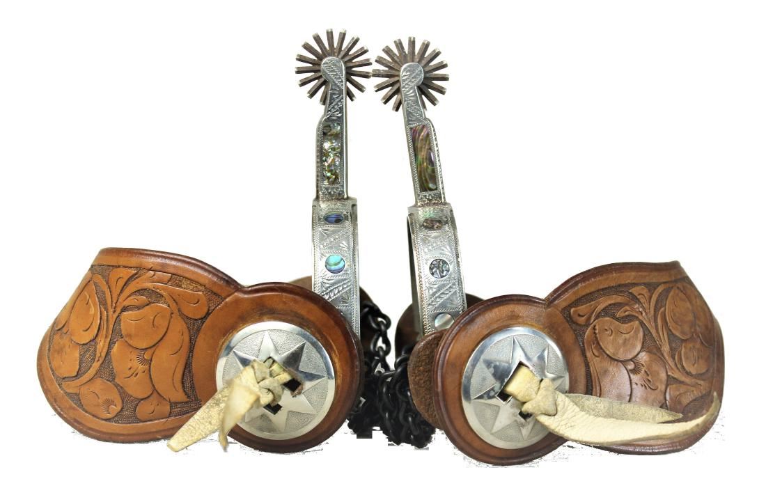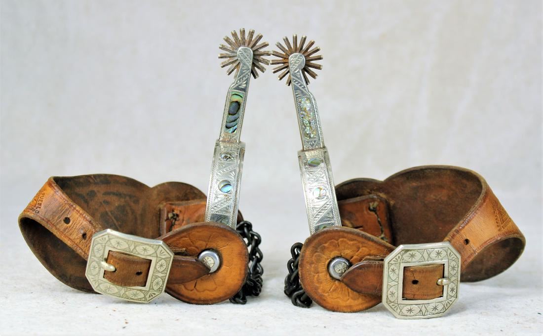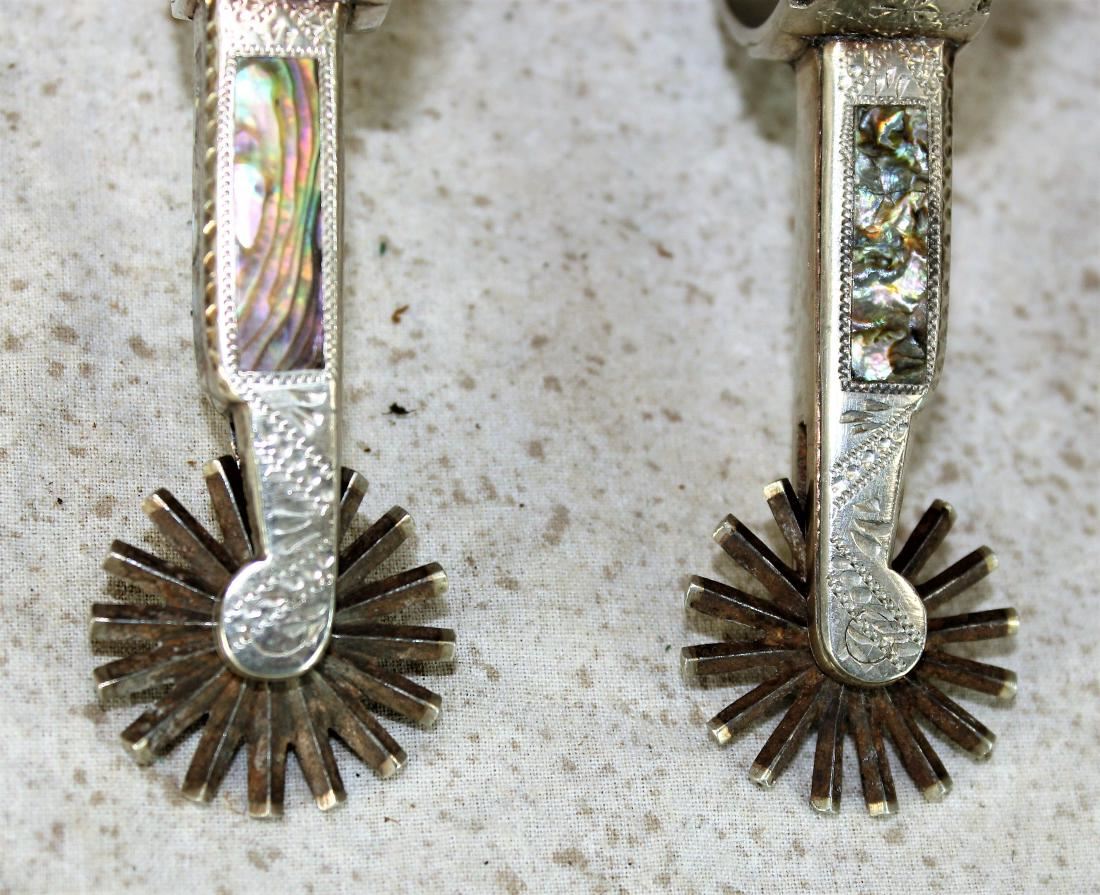 Phenomenal extra dainty sized double inlaid cowgirl spurs, incorperating abalone inlays with finely engraved silver, and topped off with silver tipped multi-point rowels, and inlaid strap buttons. Accented by wonderful marked RT Frazier straps with Canon City engraved clip corner buckles. In nearly unworn condition and showing beautiful patina.