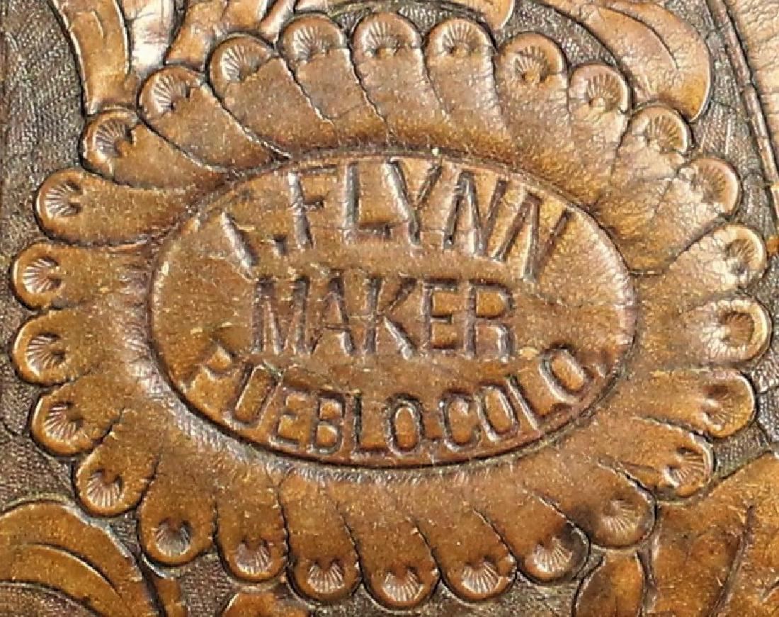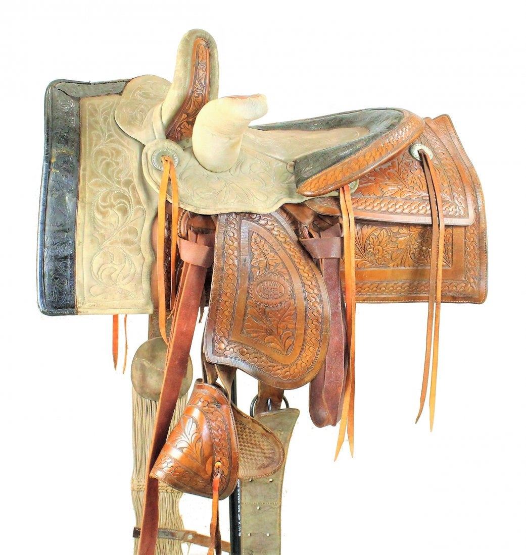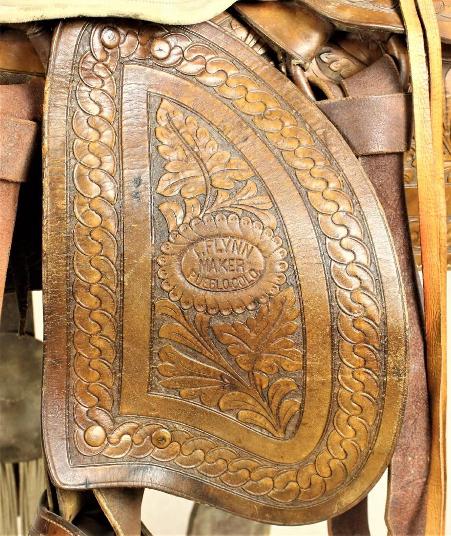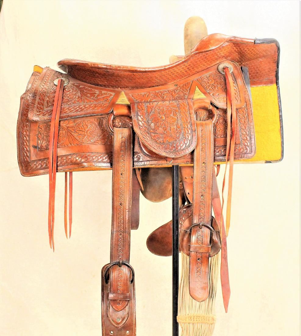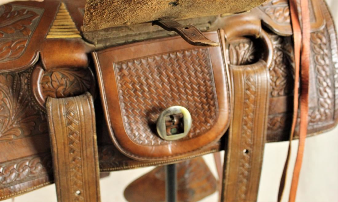 A masterpiece of craftmanship, this saddle is fully hand tooled with interesting floral patterns and quilted seat. It boasts nickel saddle string conchos, fantastic covered stirrup, double horns and off-side pouch. Topping this saddle off are it's original tooled billets and cinches. With fantastic tooled fender centered with its rare Colorado maker's mark. In wonderful over all condition with pleasing caramel colored finish, original saddle strings and lining.
