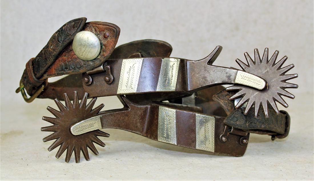 Large single mounted spurs with crisply engraved silver bars oversized rowels. Nicely marked under Kelly strap hangers and finished with original straps.