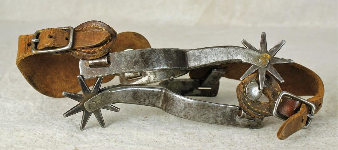 Rare two-tone single mounted spurs with swinging heart buttons and 8 point rowels. Displaying a great look and patina.