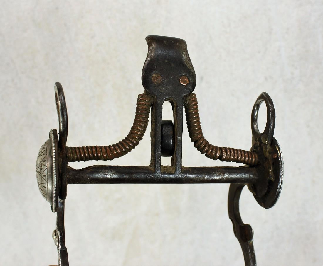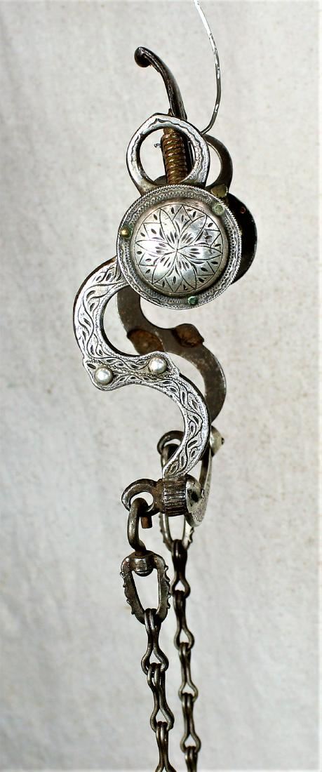 Fantastic "S" Shank bit with spade mouthpiece, beautifully engraved silver inlay, silver conchos and original rein chains.