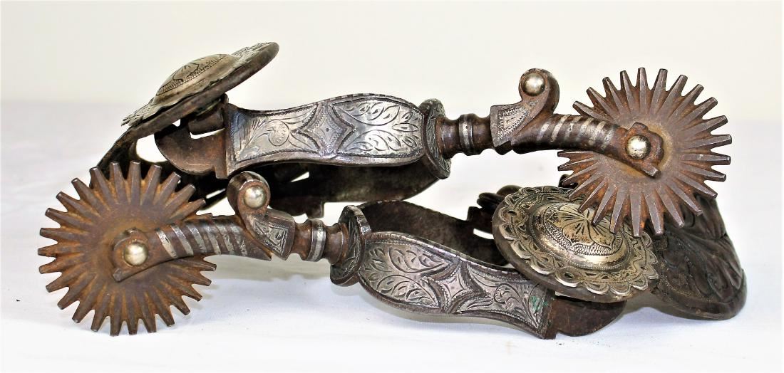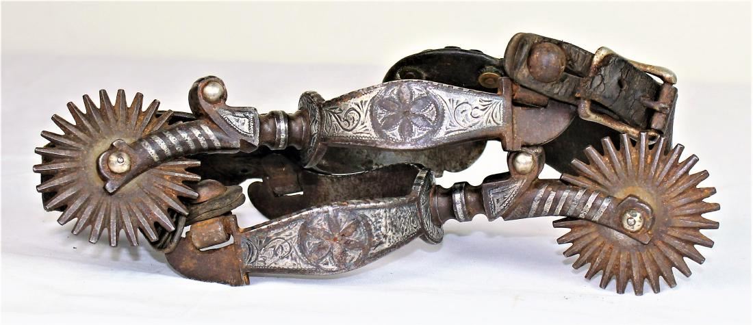 Eye catching massive pair of early California style double inlaid spurs, unmarked, but clearly showing many GS Garcia characteristics, with inlaid Roosevelt pattern on one side and Dandy pattern on the other, large multi-point rowels and original straps.