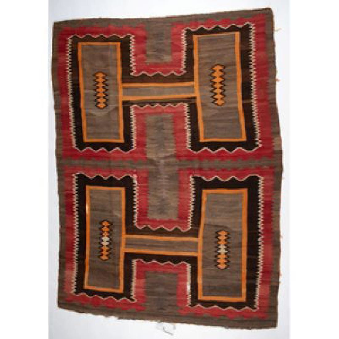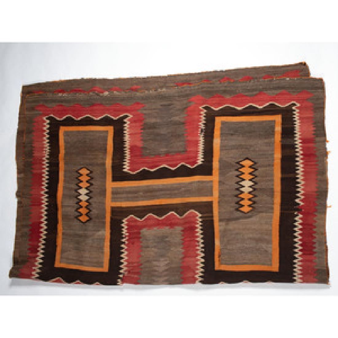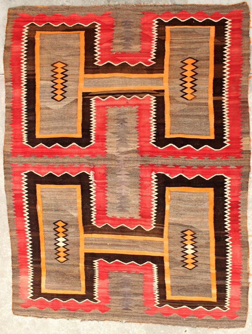Hand-spun wool woven in colors of red, orange, browns, and cream; designed with two large, rectangular geometric elements, measuring 87 1/2"x 66". In good overall condition with minor selvage loss and 5" line of separation at center.