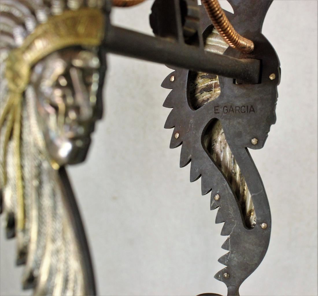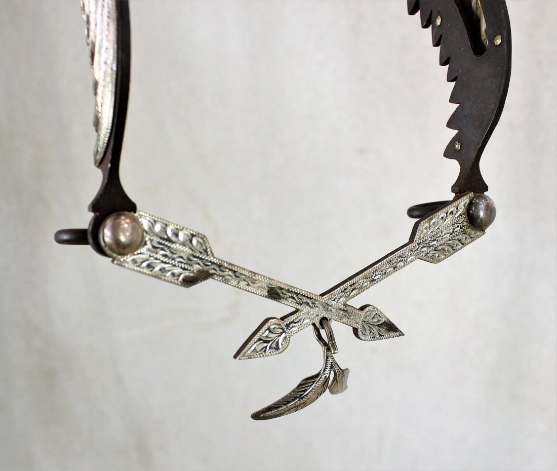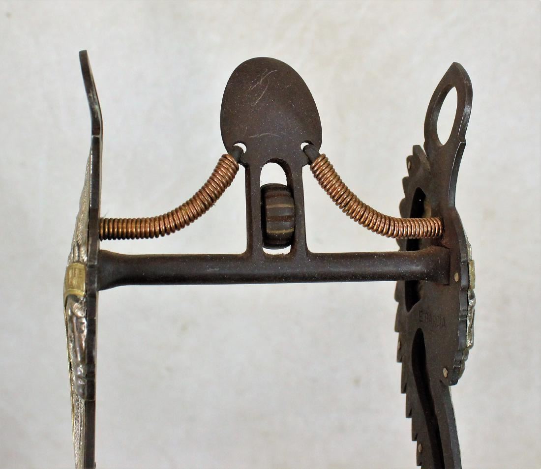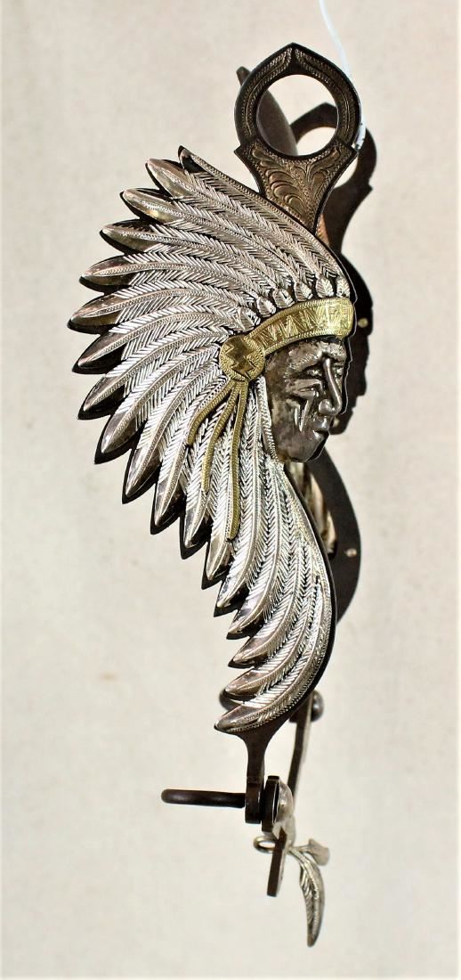 Very attractive maker marked, E. Garcia figural three dimension Indain Chief bit with great head dress, crossed arrow lip bar, and spade mouthpeice.