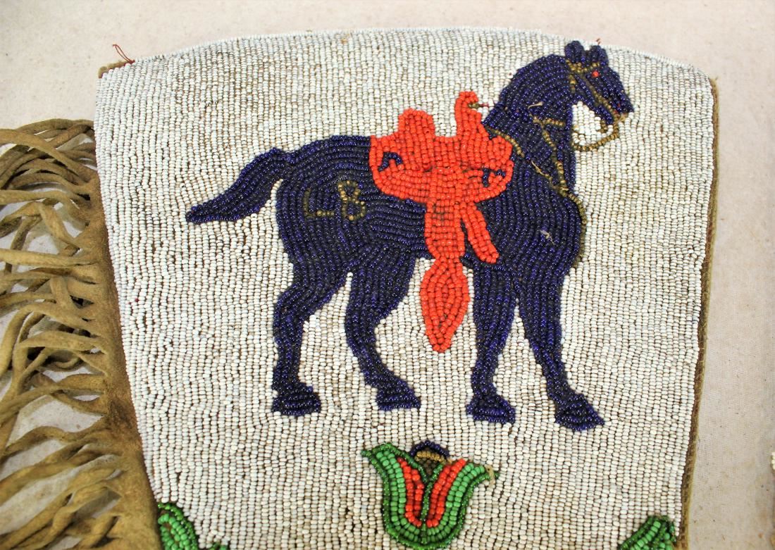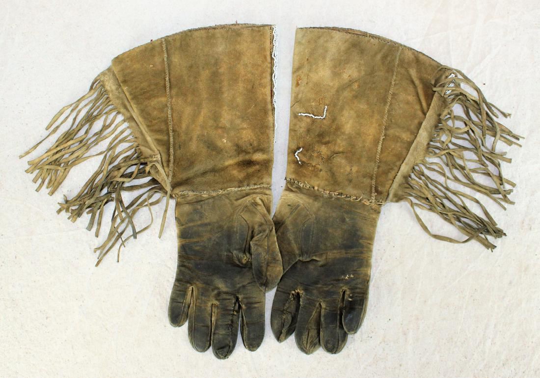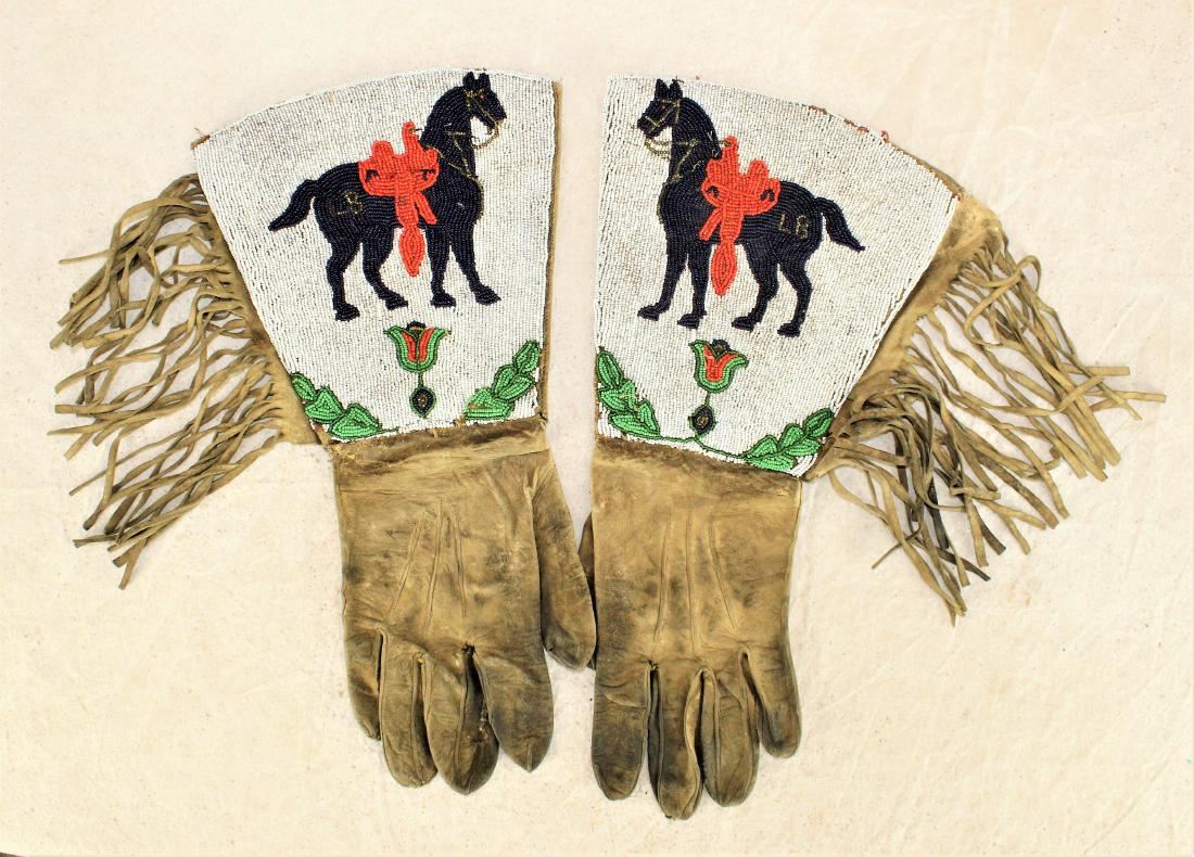 Wild West period pictorial gauntlets with fully beaded cuffs focusing on saddled horses with ranch brands, and set off by nice long fringe.