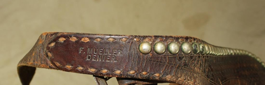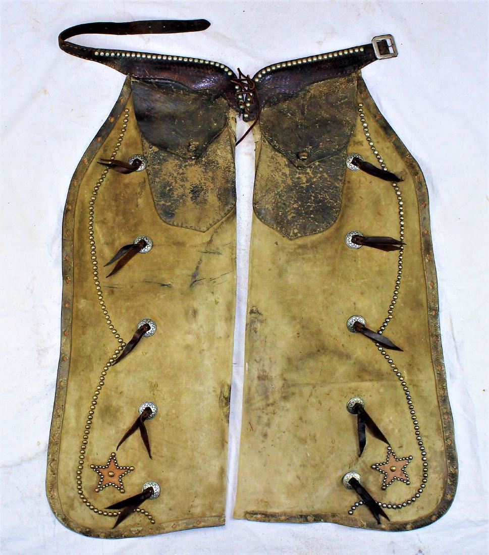 Interesting Colorado made studded batwing chaps with decoratative wings, studded stars and large pockets in ranch used condition.