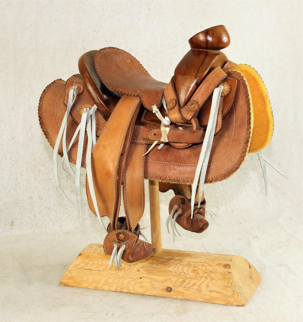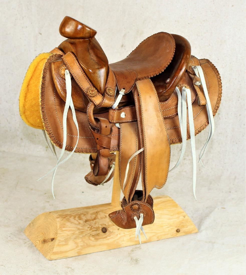 Great looking salesmans sample Mexican style saddle in a unique size, with seat measuring 5", having mint condition light colored leather and wooden tree. Maker marked tree, Sabino Gonzalez.