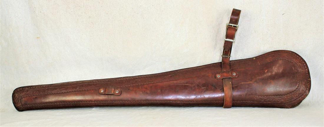 Large light colored scabbard with tripple "H" rivets and flower tooled border, in beautiful condition.