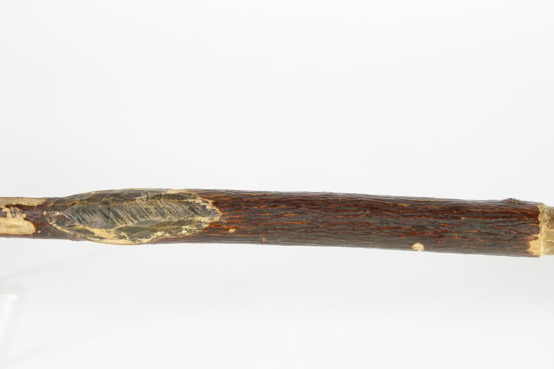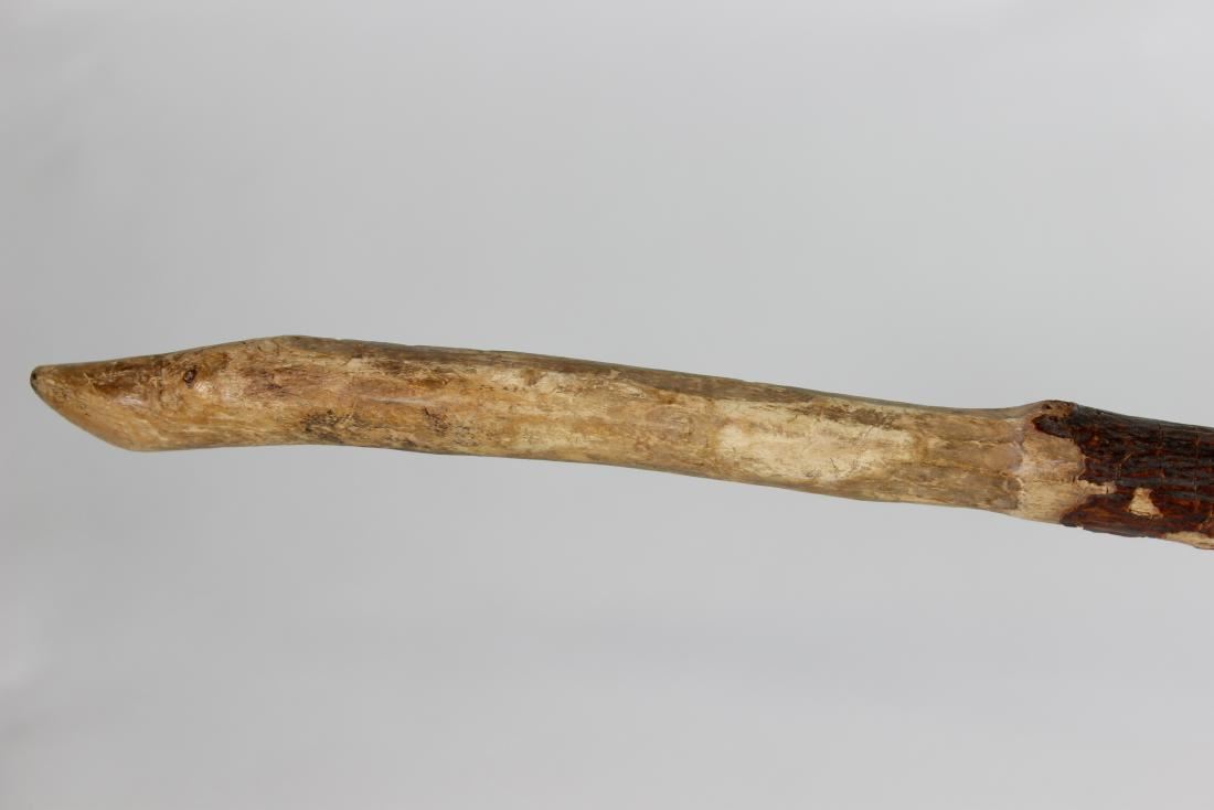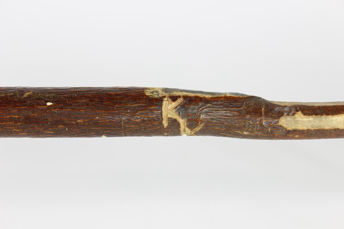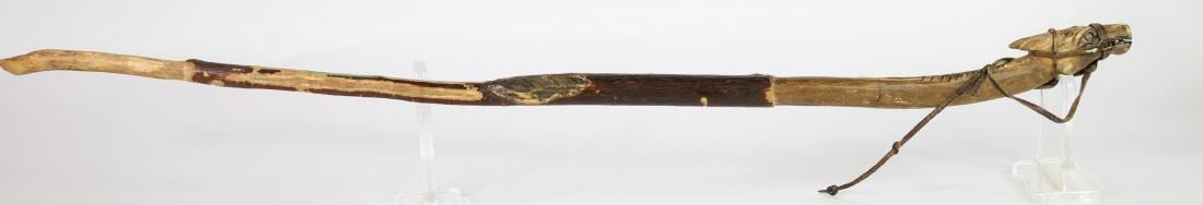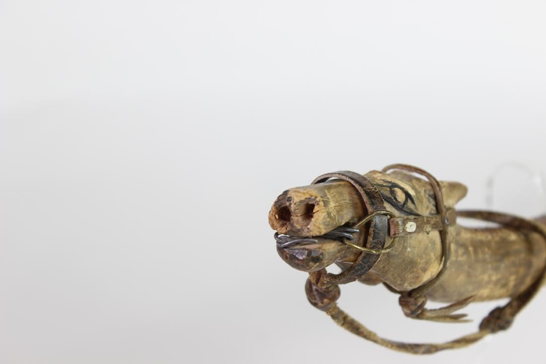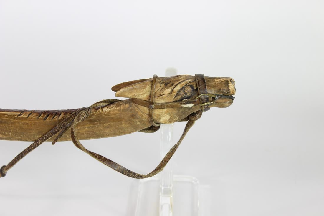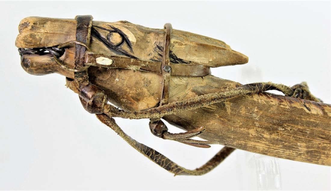 Carved wooden Plains horse dance stick, one piece long, 40" in fine condition displaying wonderful patina. Carving of the head is nicely accomplished with KK initials incise carved 3/4" tall. Bridle and reins are made of harness leather, the bit from twisted wire. All display beautifully. From a Montana collection.