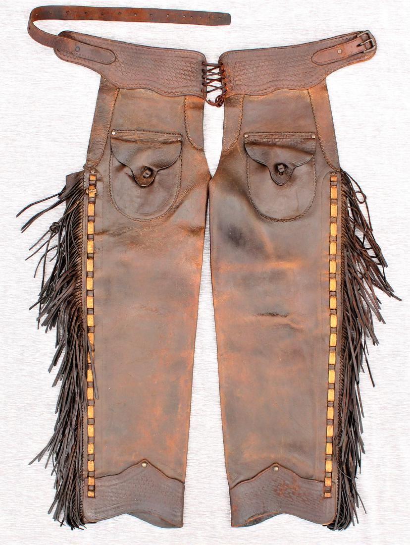 Very attractive early fringed shotgun chaps with straight basket stamped belt, showing great condition and light color.