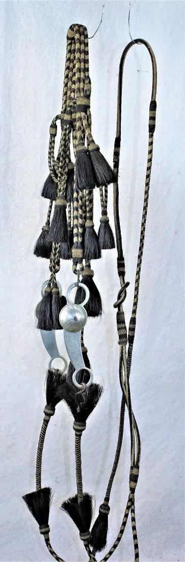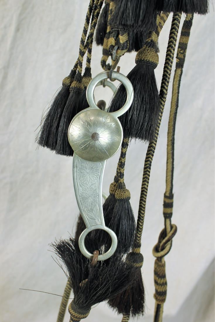 Interesting early black and white finely braided bridle covered in fantastic decorative tassels, with fantastic romel reins and Canon City Prison bit.