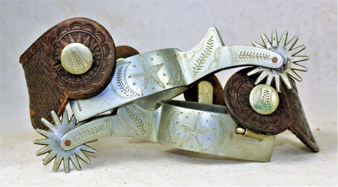 Massive Star Steel Silver wide heelband spurs with Beason Special engraving pattern, great maker's mark and original basket stamped straps.