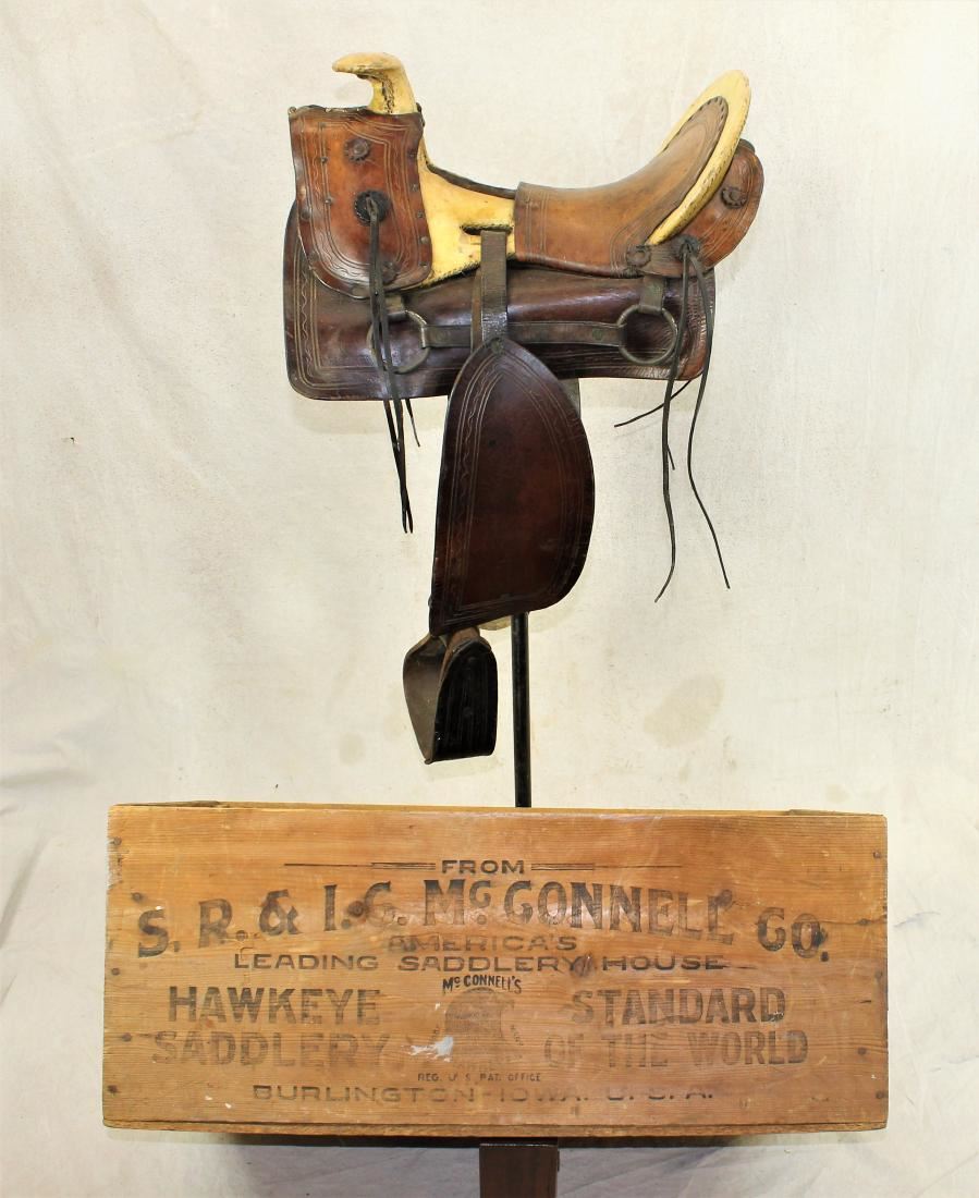 Desirable early Hope style saddle with exposed rawhide and light colored leather. Made by I.G. McConnell Company and accompanied by it's orginal saddle crate showing fantastic stencil and label.