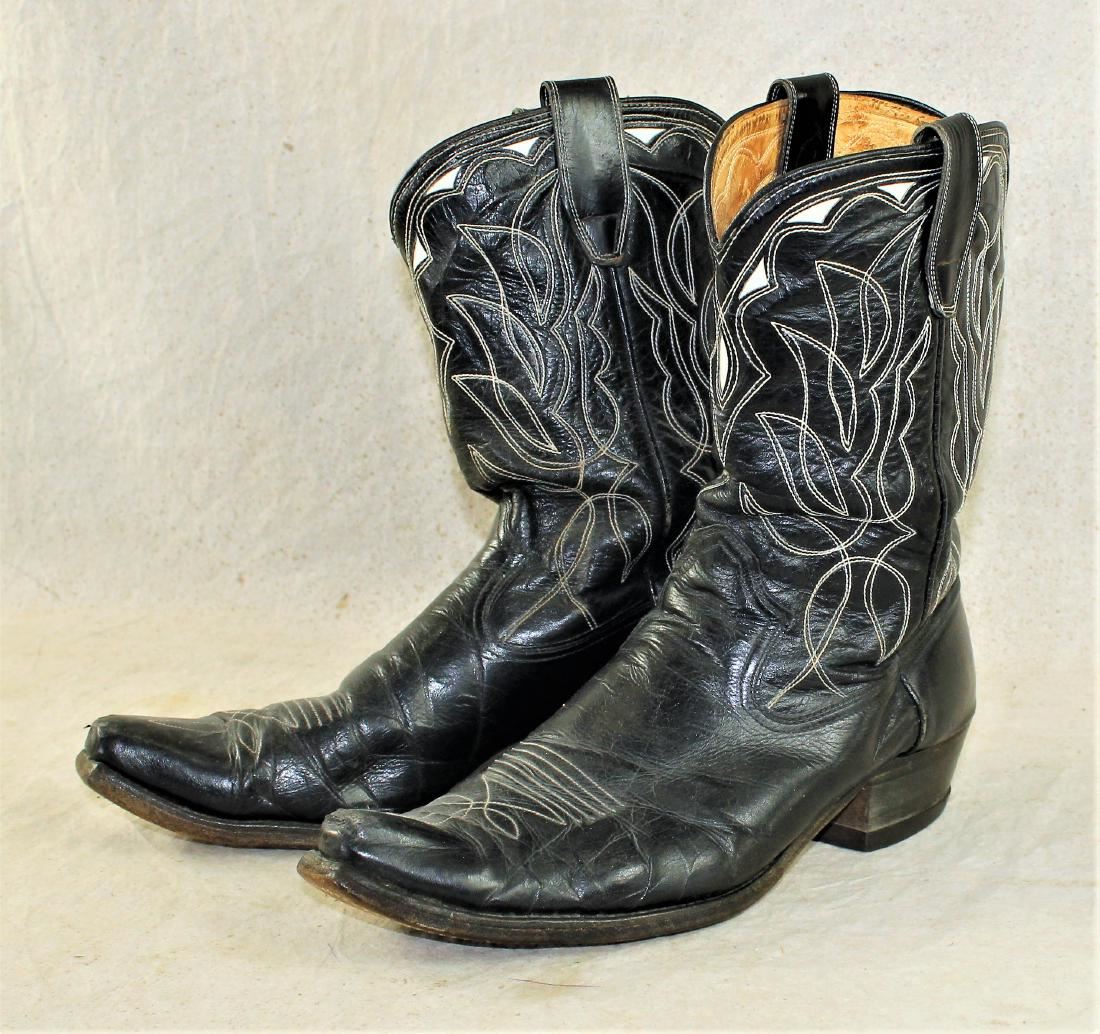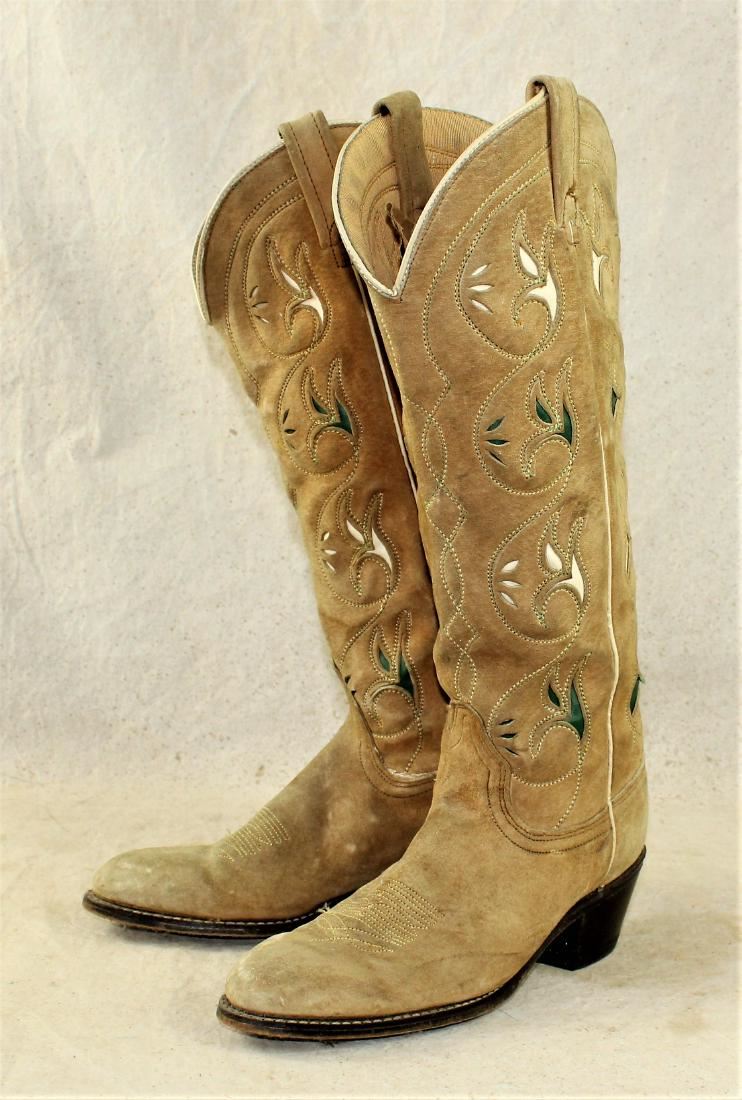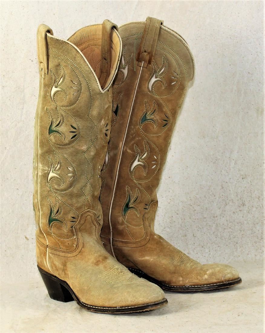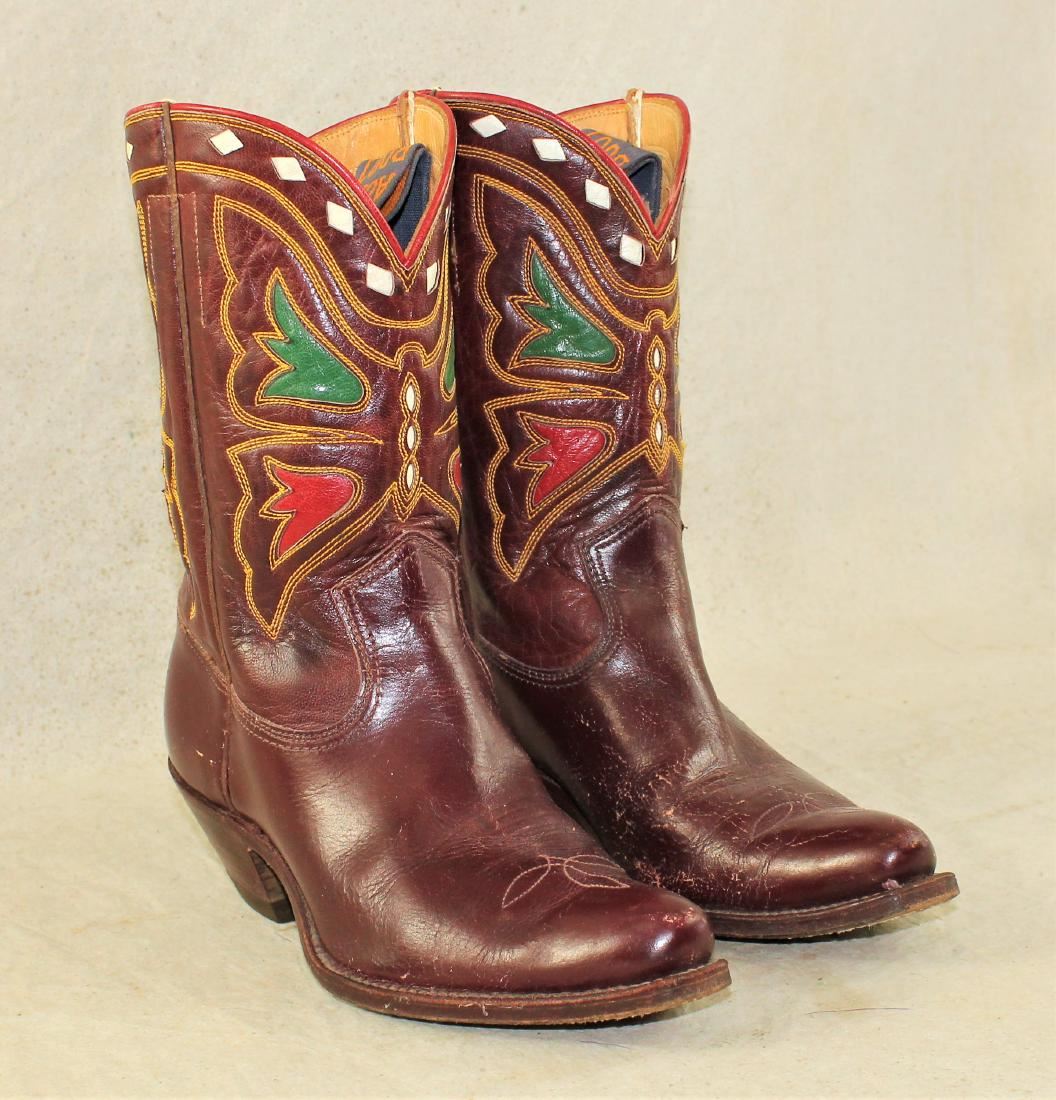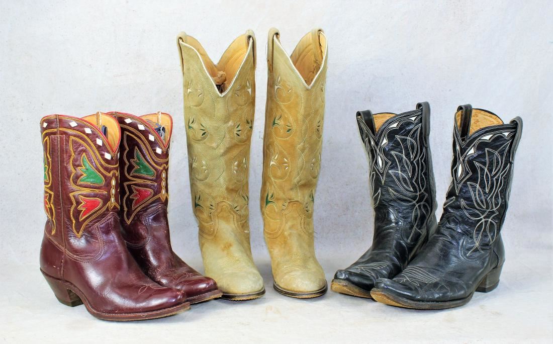 Three great pairs of cowgirl boots consisting of 1) Acme shorty top cut-out boots in size 7. 2) Acme shorty top boots with great stitched tops in size 11. 3) Custom made tall top boots with cut-out design in approx. size 7.