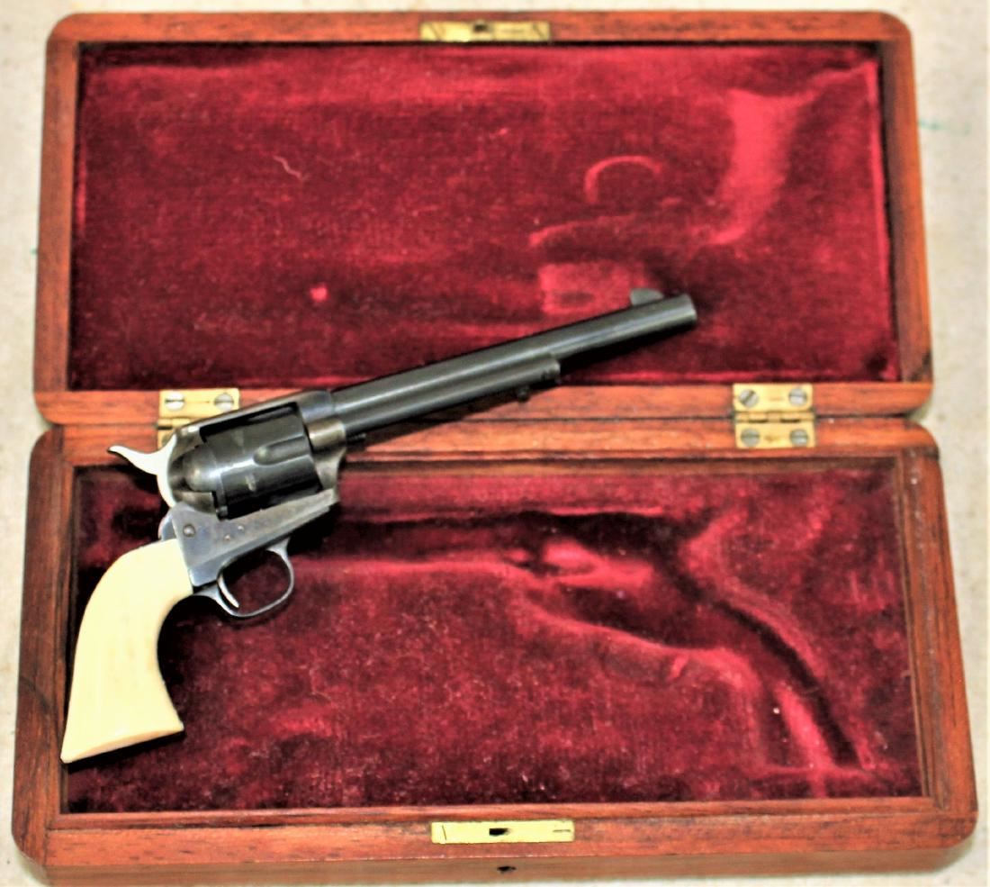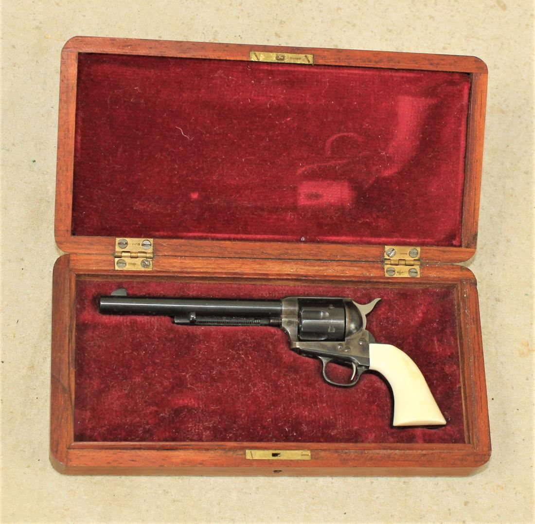 Interesting functional miniature Colt single action revolver with faux ivory grips in wooden case.