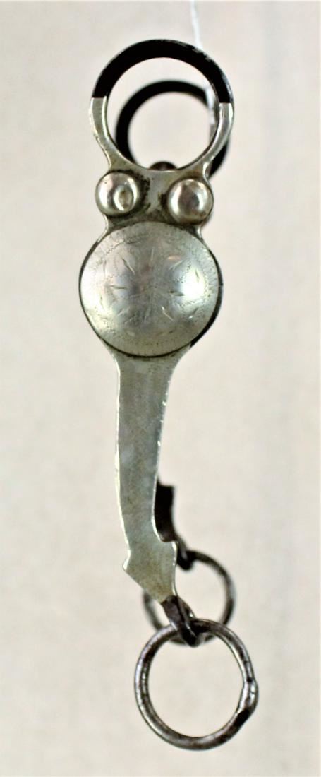 Very scarce arrow shank port mouth bit with nicely engraved full overlay and conchos, with very uncommon loose rein rings.
