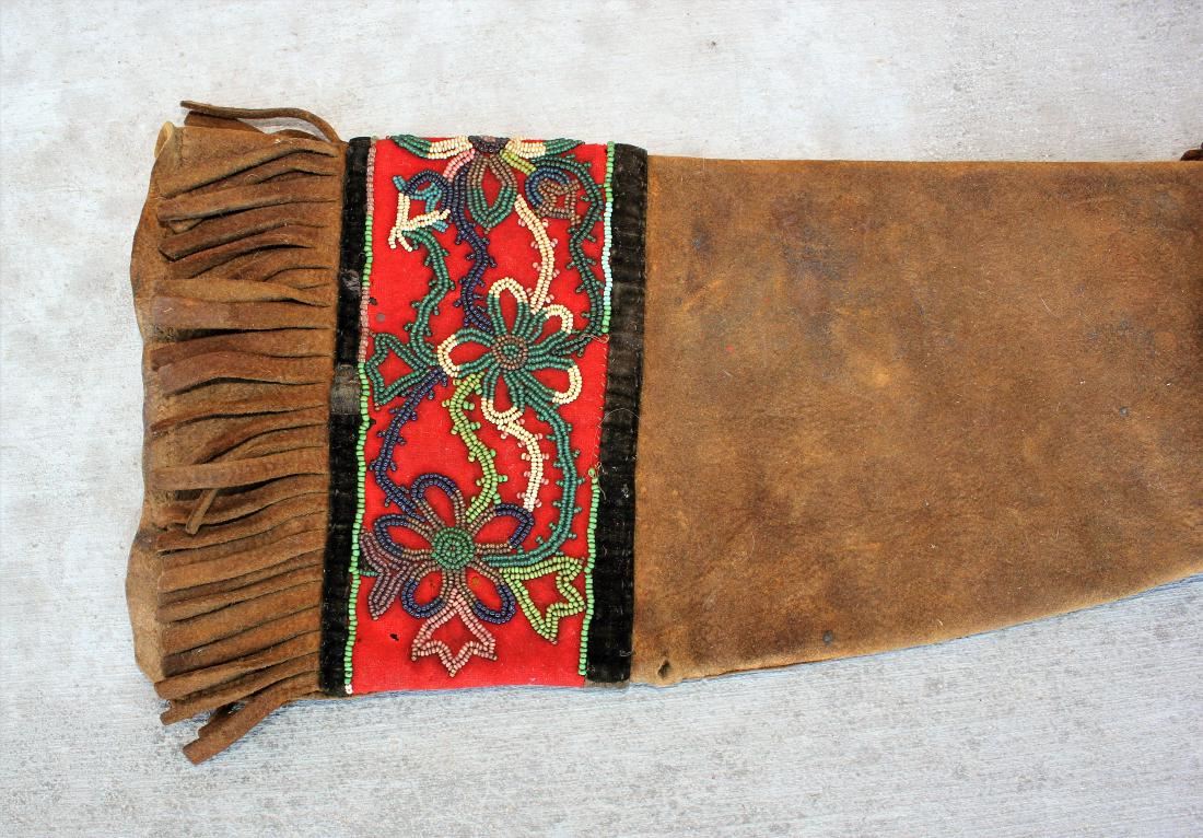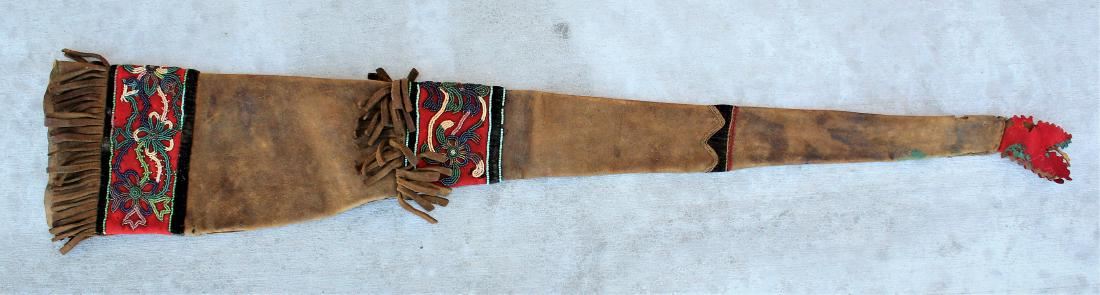 Fringed Cree scabbard for lever action rifle, with beautifully floral pattern beaded on trade cloth decorative pattern.