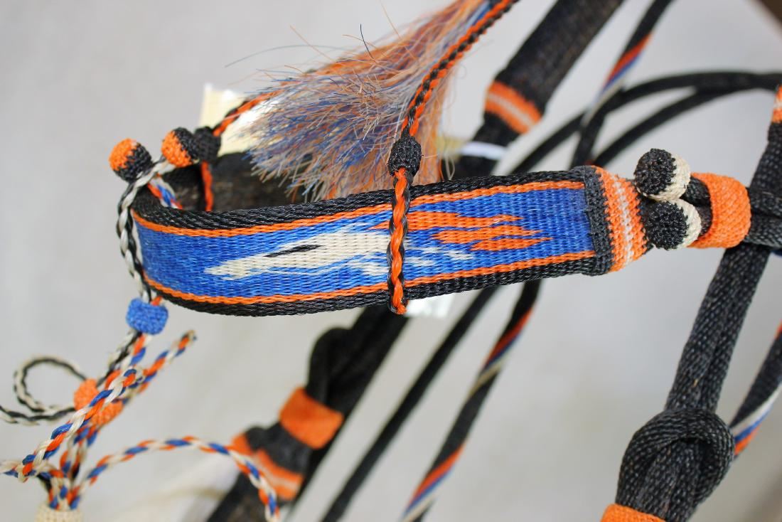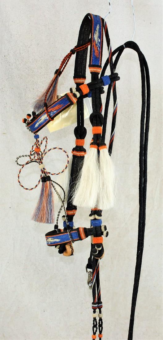Great one of a kind prison made hitched horsehair bridle with Denver Bronco motif hitched throughout. With bright colors and new condition, accented by silver mounted bit.
