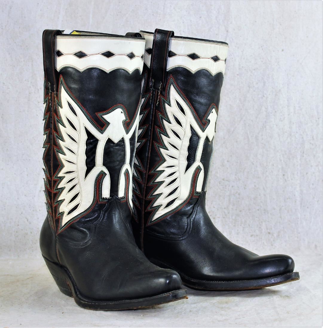 Interesting men's stovepipe boots with multi colored thunderbird overlay uppers and riding heels. In men's size 7 1/2.